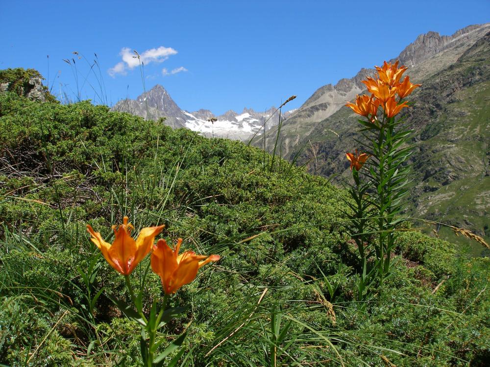 ... et fait une photo digne d'une carte postale : "Lys orangés dans le vallon de la Lavey. Au fond, l'aiguille du Plat de la Selle, au-dessus du cirque du Soreiller