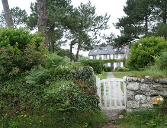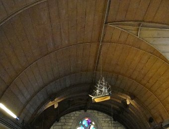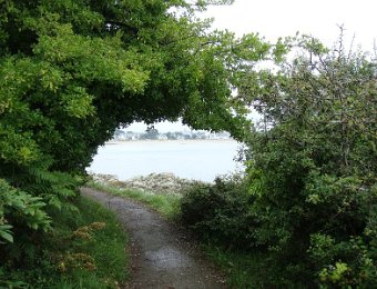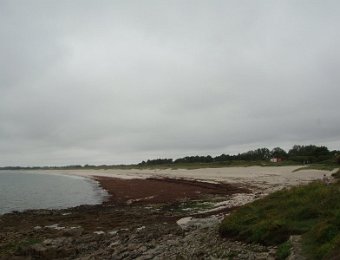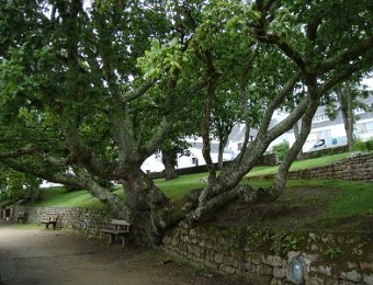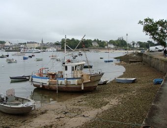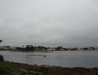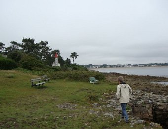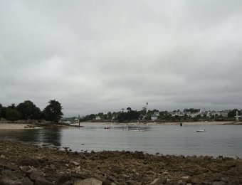 D'ailleurs celle de l'église Saint-Thomas Becket (1431) a été refaite plusieurs fois.La nef aussi, après la chute du clocher due à une tempête en 1836. Mais le style d'origine, transition roman-gothique, a été repris.À Bénodet, comme partout en Bretagne, les toitures c'est important.Passage sur la rive droite de l'Odet (pointe de Combrit, Sainte-Marine). On voit Bénodet en face ...... et tout l'estuaire ...... parcouru par le bateau touristique que nous prendrons après-demain.Le long de la côte rocheuse ...... avec ses laminaires arrachées au fond et ses mares à secrets.Ici aussi la Terre est ronde .Au loin, les plages vers Île-Tudy (Kermor, Teven et la Grande Plage). 24_juin__pluie__Combrit26_juin__Locronan