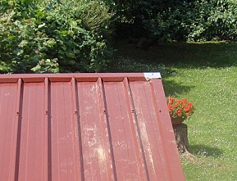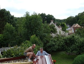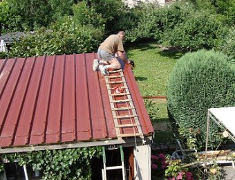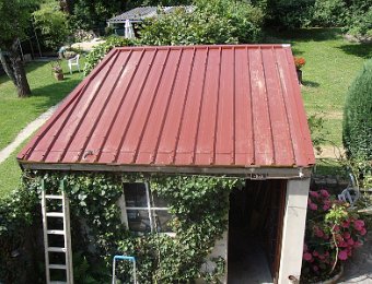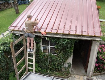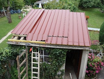 La cabane au tonton attend un toit tout neuf ...... avec ces magnifiques tôles censées être "sur mesure".Première phase : le détuilage ...... pas difficile, mais fastidieux.Heureusement, il fait beau.Comme souvent, quelques mauvaises surprises. Nous dérangeons un magnifique nid de fourmis ...... et, sous les nouveaux chevrons, il faut supprimer un panneau ...... et même plusieurs.Bon, on passe aux choses sérieuses. Monter les tôles ...... et vérifier que tout va s'emboîter. Promenades