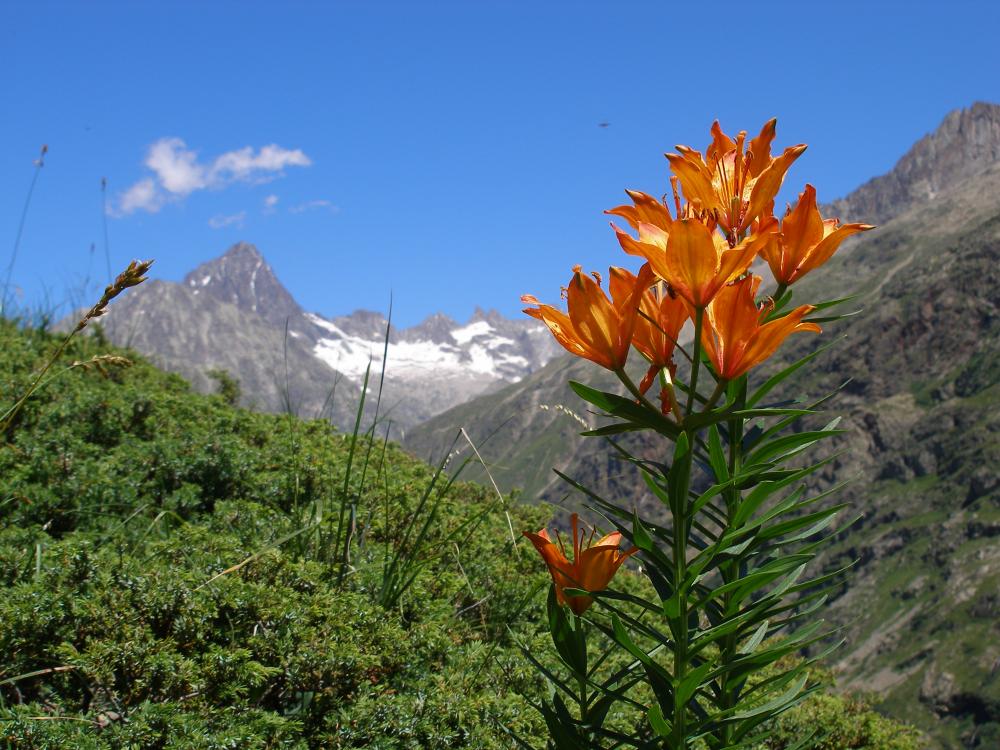 ... et fait une photo digne d'une carte postale : "Lys orangés dans le vallon de la Lavey. Au fond, l'aiguille du Plat de la Selle, au-dessus du cirque du Soreiller