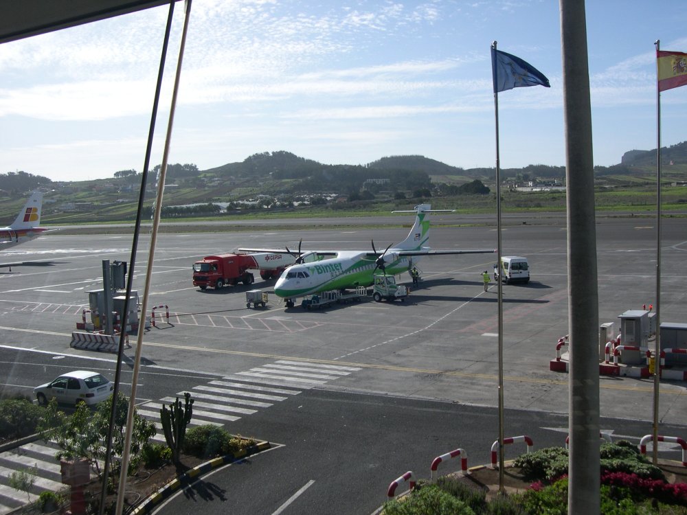 A l'aéroport, un des avions à hélices assurant le trafic entre les différentes îles des Canaries