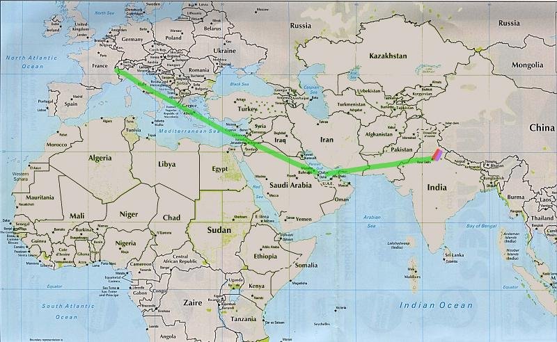 Avion Genève-Doha + Doha-Delhi + taxi Delhi-Roorkee. Retour Roorkee-Delhi par train