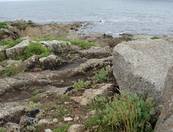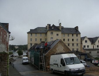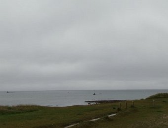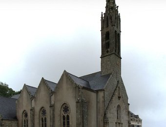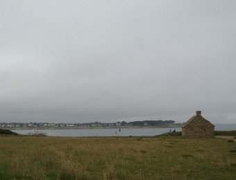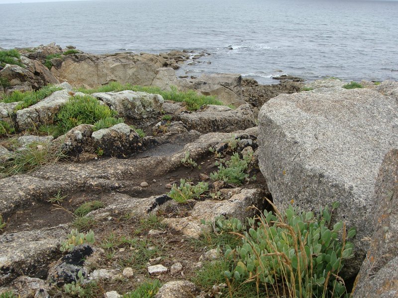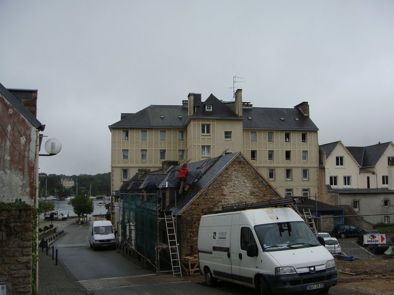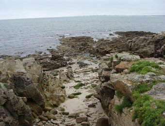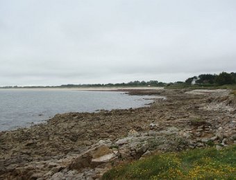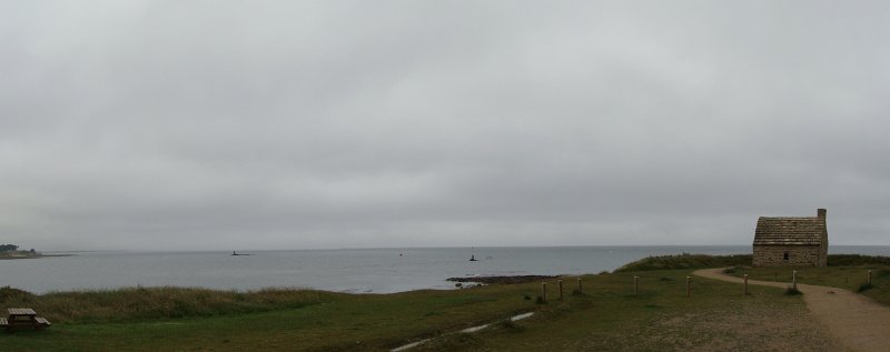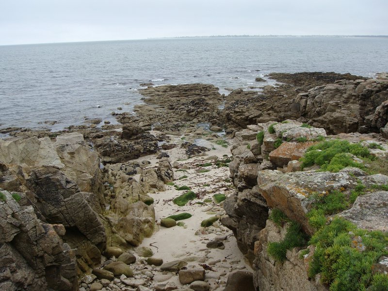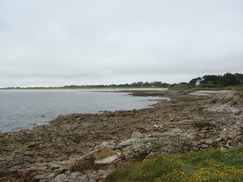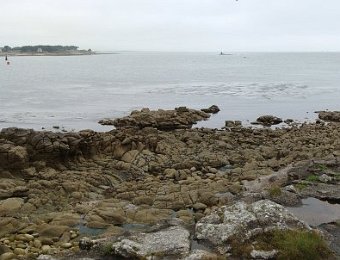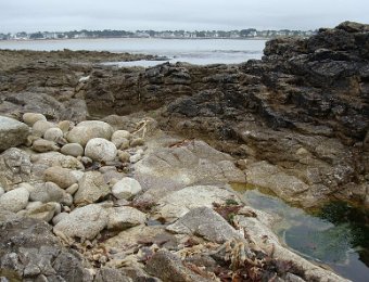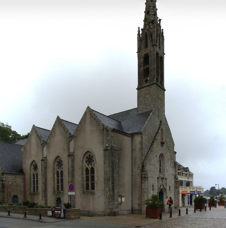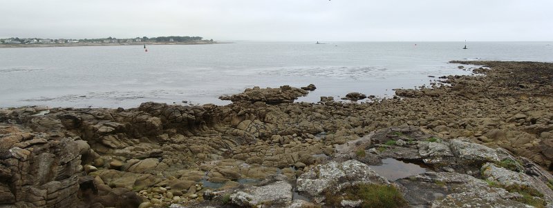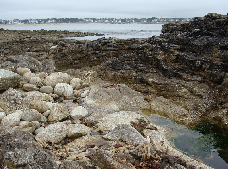 D'ailleurs celle de l'église Saint-Thomas Becket (1431) a été refaite plusieurs fois.La nef aussi, après la chute du clocher due à une tempête en 1836. Mais le style d'origine, transition roman-gothique, a été repris.À Bénodet, comme partout en Bretagne, les toitures c'est important.Passage sur la rive droite de l'Odet (pointe de Combrit, Sainte-Marine). On voit Bénodet en face ...... et tout l'estuaire ...... parcouru par le bateau touristique que nous prendrons après-demain.Le long de la côte rocheuse ...... avec ses laminaires arrachées au fond et ses mares à secrets.Ici aussi la Terre est ronde .Au loin, les plages vers Île-Tudy (Kermor, Teven et la Grande Plage). 24_juin__pluie__Combrit26_juin__Locronan