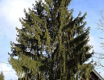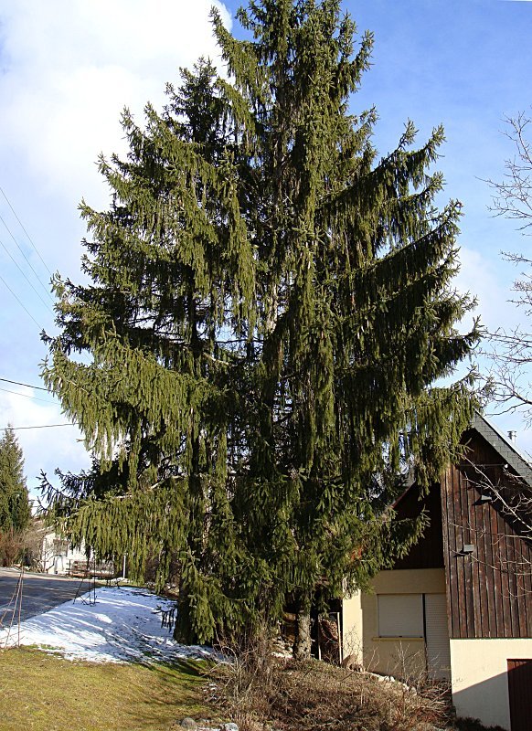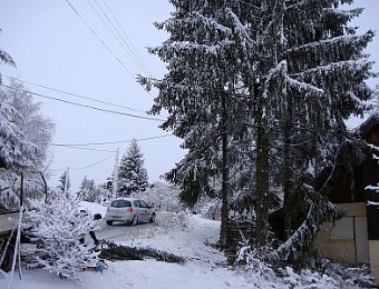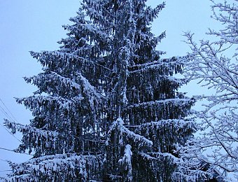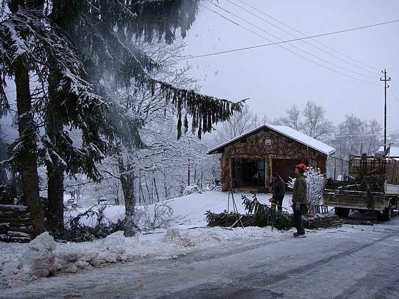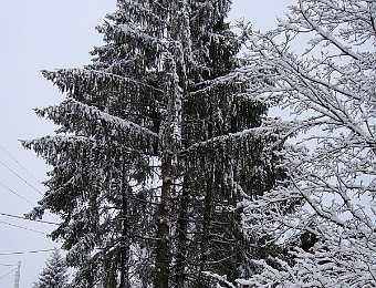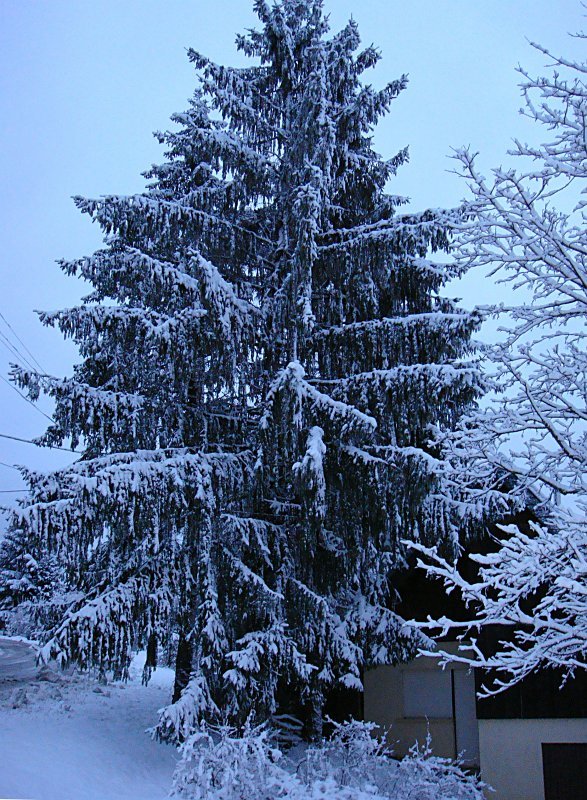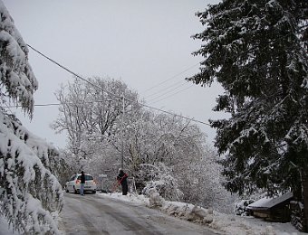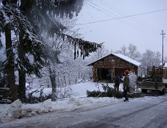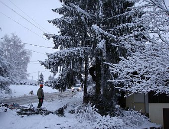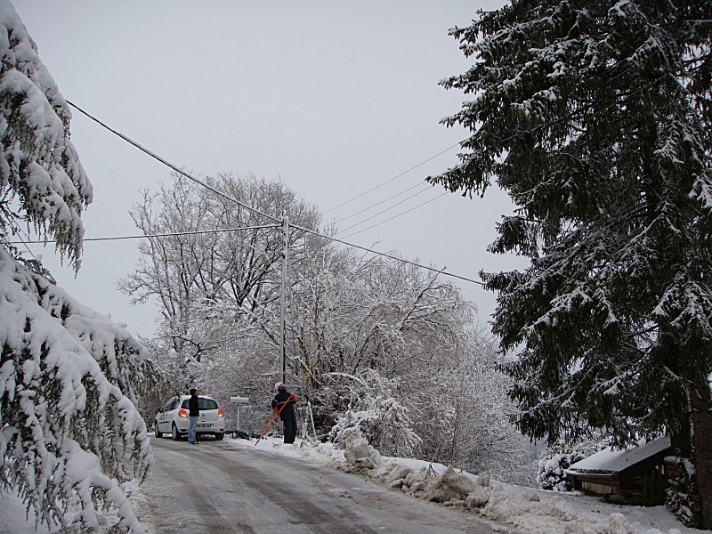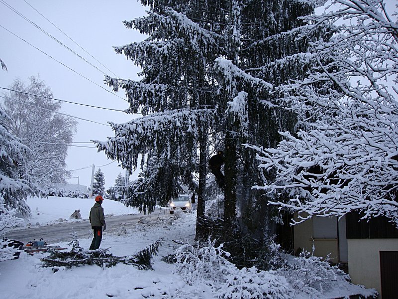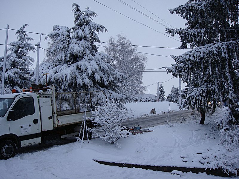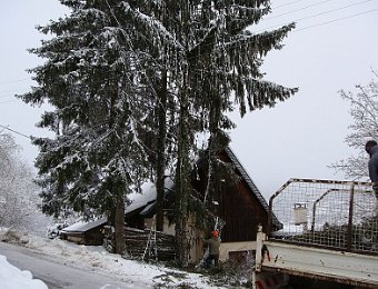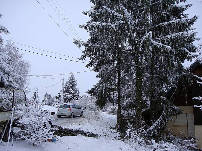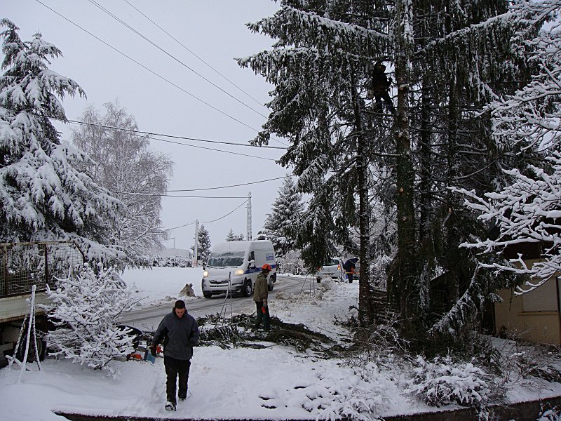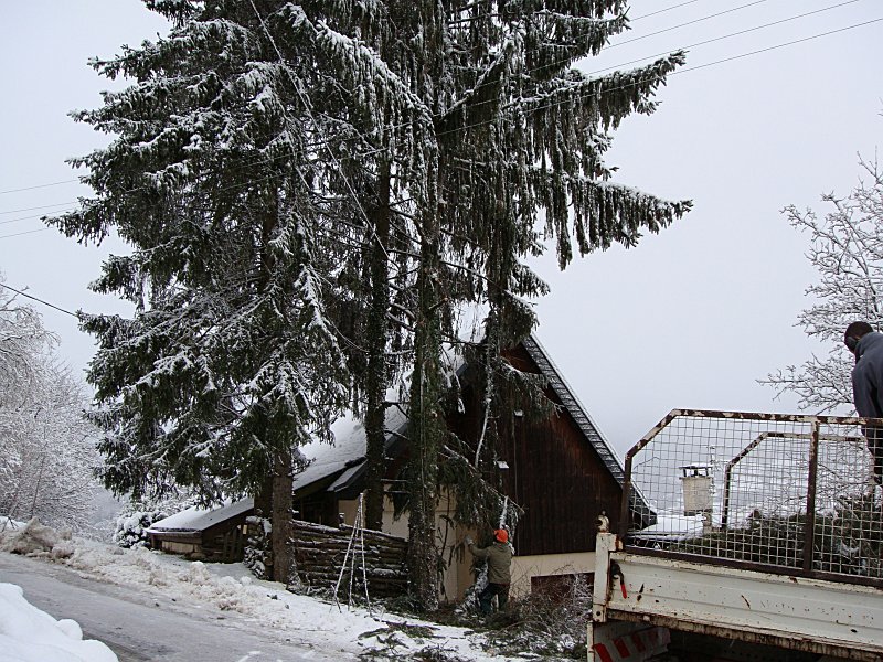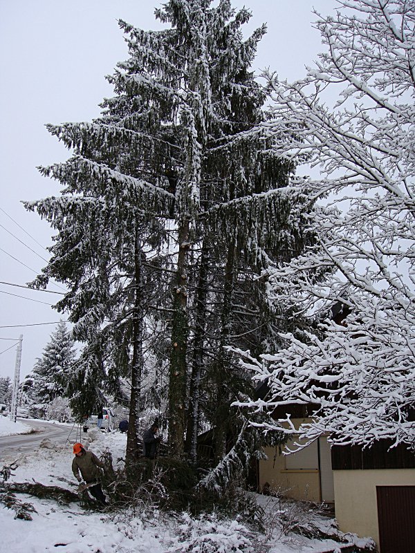 Trop grands, les quatre épicéas menacent les fils électriques et téléphoniques ...... surtout sous la neige.L'abattage est requis (entreprise La Ligne du Temps).L'élagueur commence à monter, en ébranchant au fur et à mesure ...... et secouant au passage les branches trop chargées.La Régie de Seyssel vient couper le courant pour quelques heures.Travail avec des cannes isolantes.L'élagage peut se poursuivre sans risque.L'élagueur est le plus expérimenté de l'équipe de trois. Les deux autres déblaient les branches ...... les chargent dans le camion ...