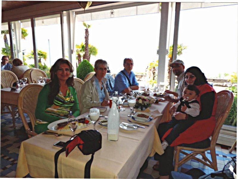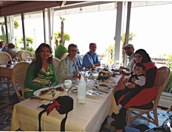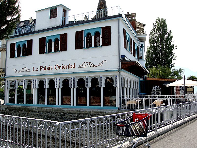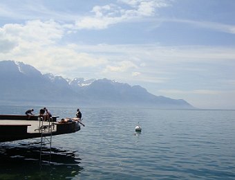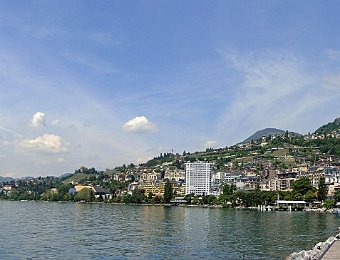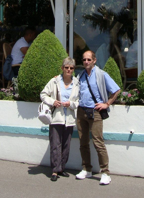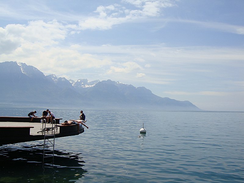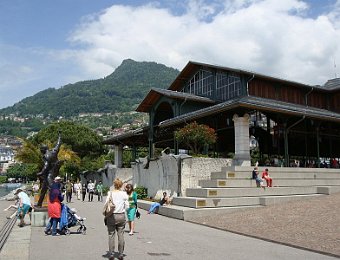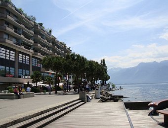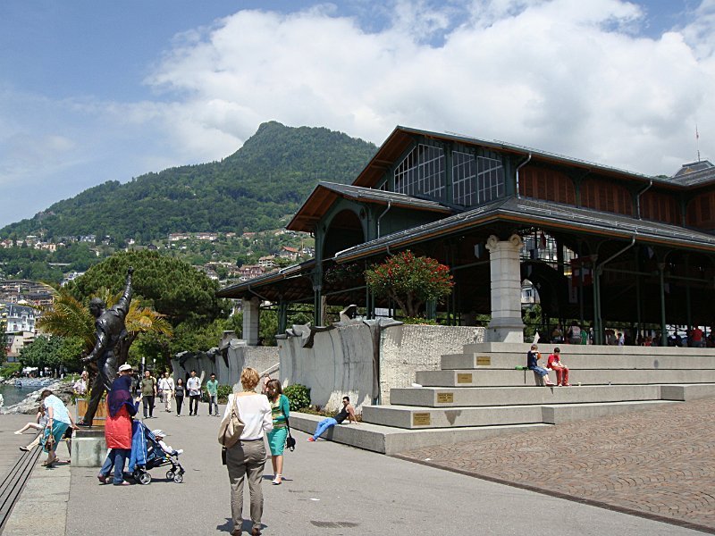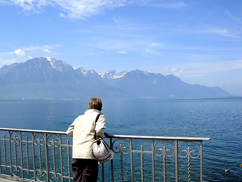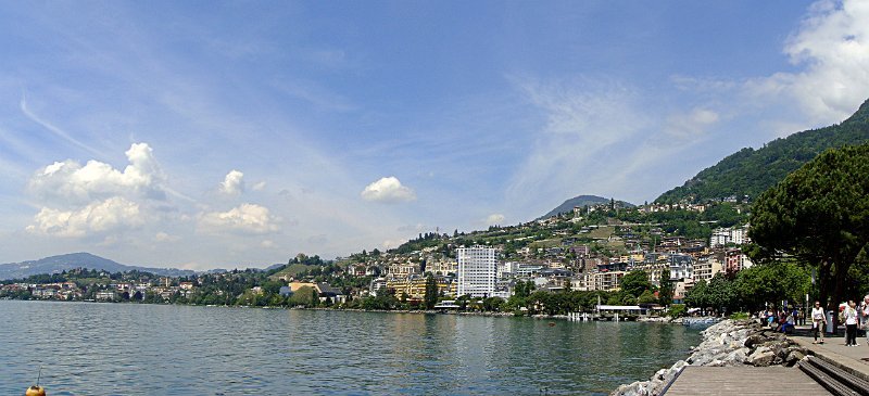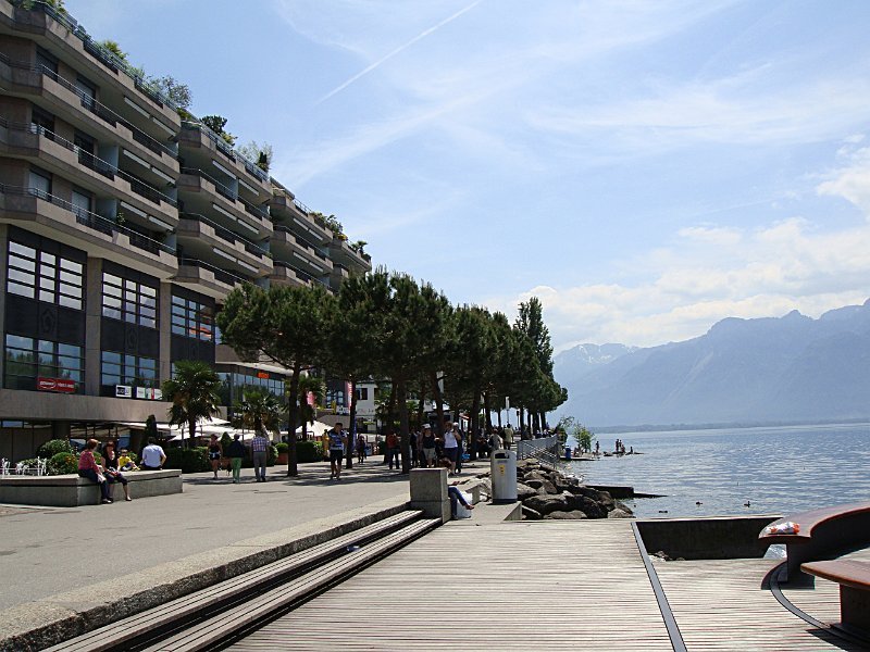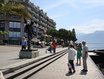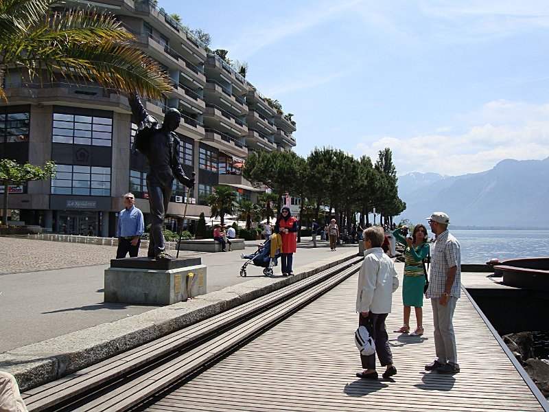 Au bord du Léman. Au loin, les Dents du Midi (3257 m) / By the Leman lake. In the distance "The Teeth of the South" (3257 m)Martine devant le Grammont et les Cornettes de Bise / Martine, in front of the Grammont and the Cornettes de Bise.Petit panorama de la ville / Small panorama of the town.Maintenant, nous allons au restaurant ... / Now we go to the restaurant ...La classique photo, parfaits touristes / The classical photo, perfect tourists.... invités par Mohammed et Khadejaa / ... invited by Mohammed and KhadejaaLa deux millionième photo de Freddy ... / The two millionth photo of Freddy ...Après le repas, une petite marche s'impose / After the lunch, a short walk is neededBronzage, mais pas de baignade (l'eau est encore à 13 °C) / Bronzing, but no swimming (water temperature is still 13 °C).Vers Freddy Mercury et le marché couvert / Towards Freddy Mercury and the market hall