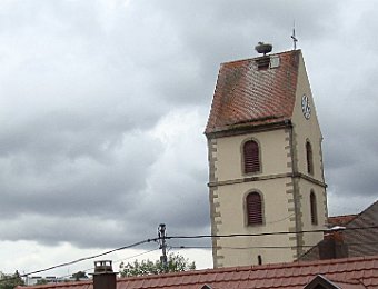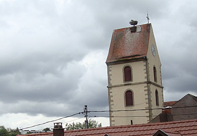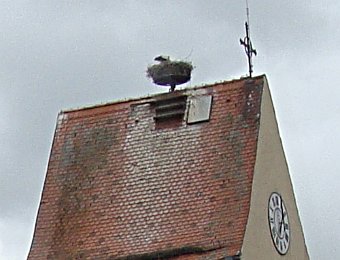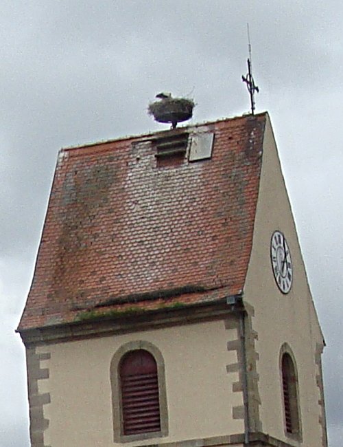 De la fenêtre de la chambre, la cigogne touristique sur l'église Saint Georges.