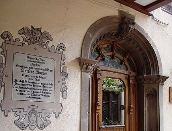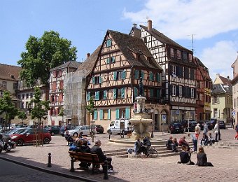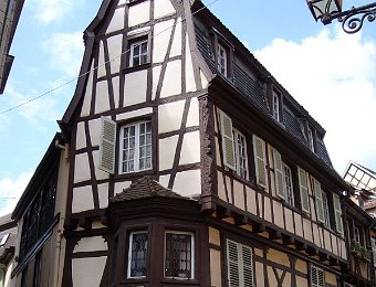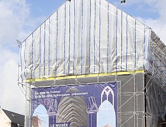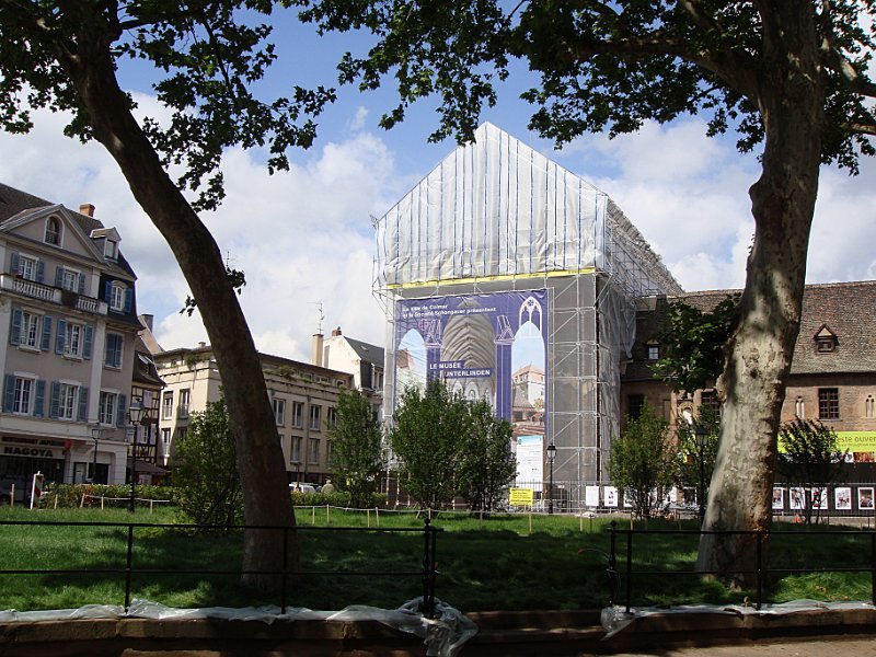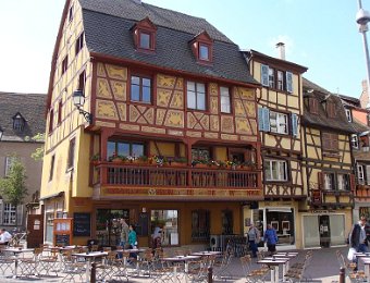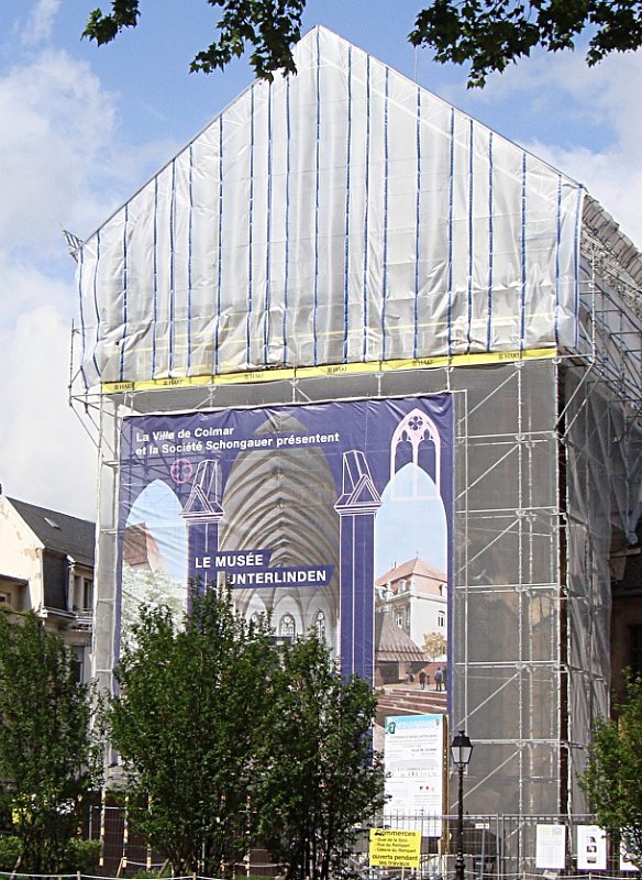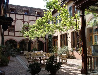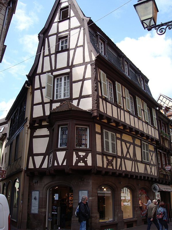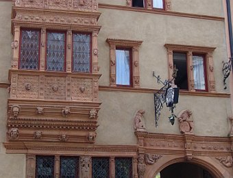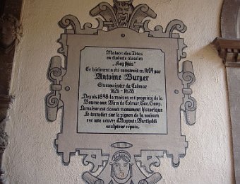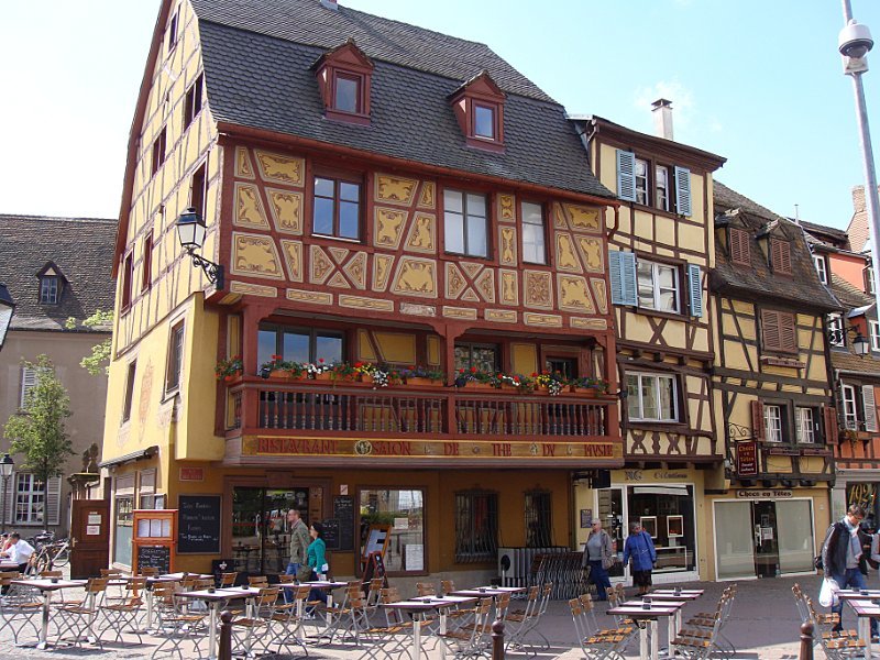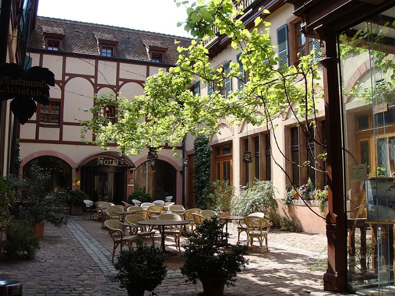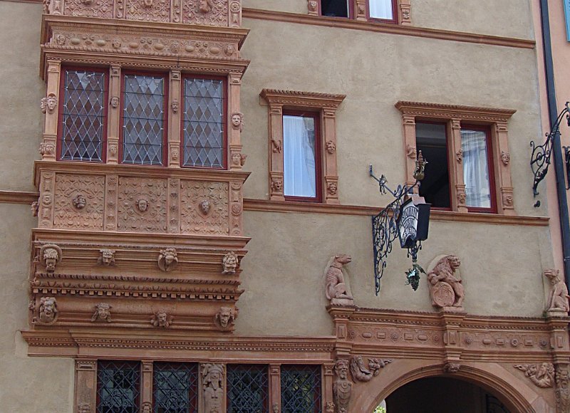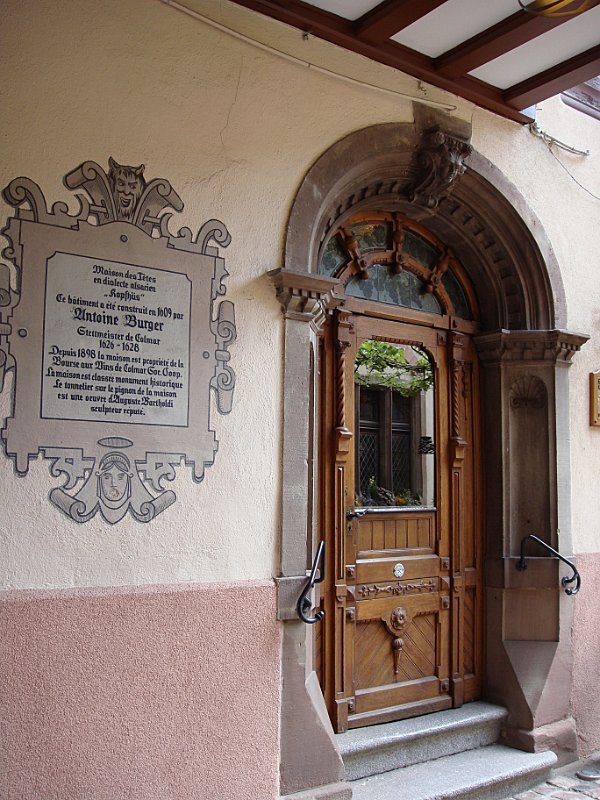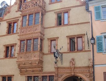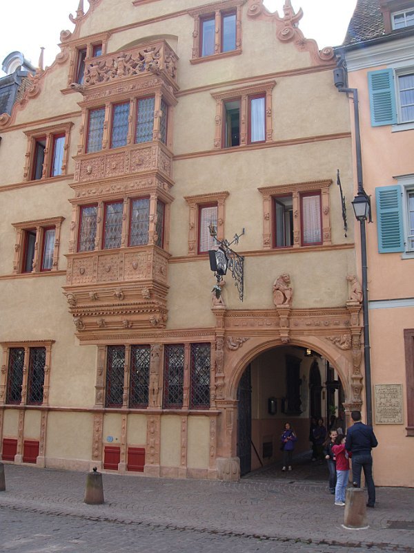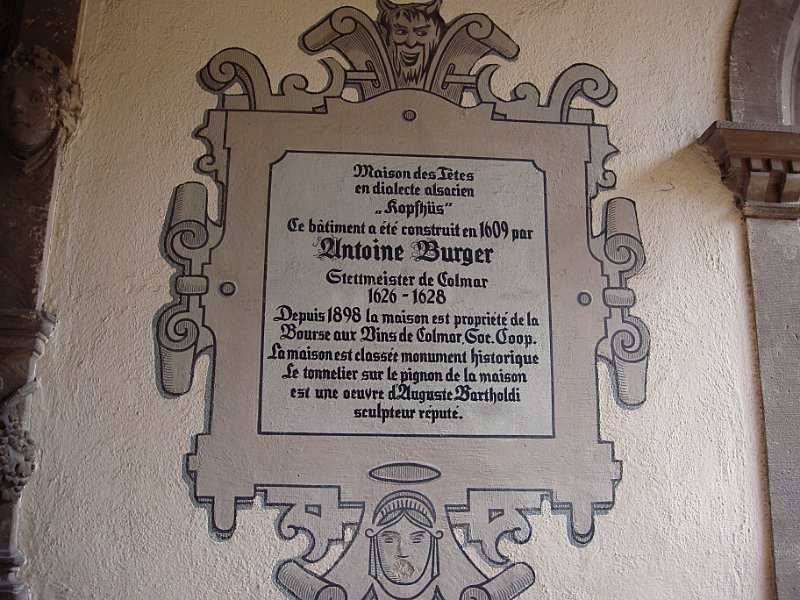 Et bien sûr le musée ...Dans la rue des Têtes, près du quai de la Sinn, le Salon de thé du musée ...Place des Six-Montagnes-Noires, avec la statue du prévôt Jean Roesselmann (1262), par Bartholdi.... Unterlinden ("sous les tilleuls"), en restauration. Ancien couvent de dominicaines....et la célèbre Maison des Têtes (1609).... un bref historique.Sur l'oriel double et les montants et meneaux des fenêtres, 106 têtes grimaçantes !Sous le porche ...Une cour intérieure, avec, évidemment, une vigne.Encore des colombages, et un petit oriel. 1_-_Mulhouse__ICSIBO__Ribeauville3_-__Ile_du_Rhin__Breisach