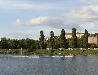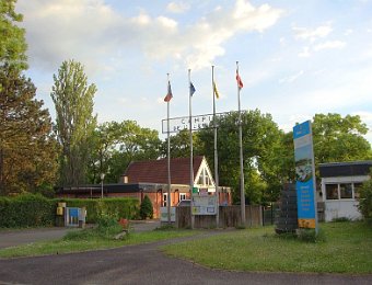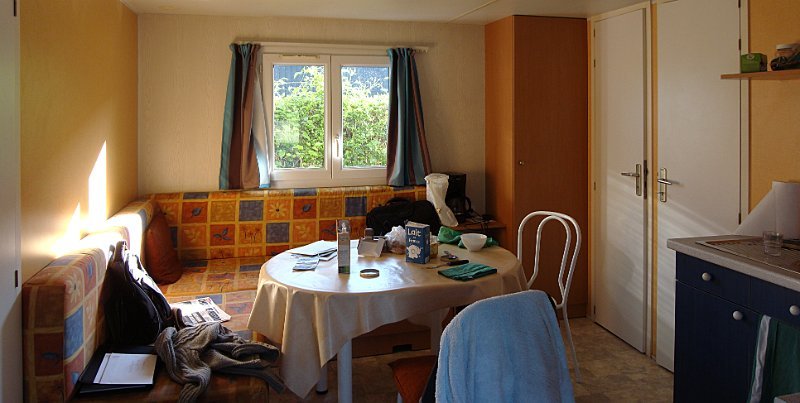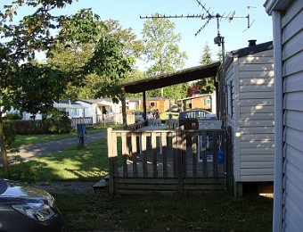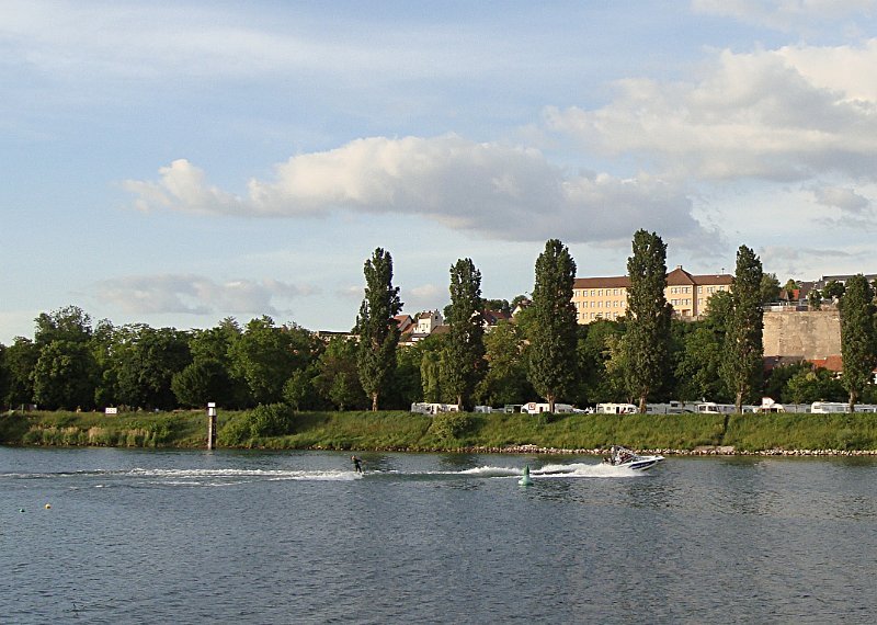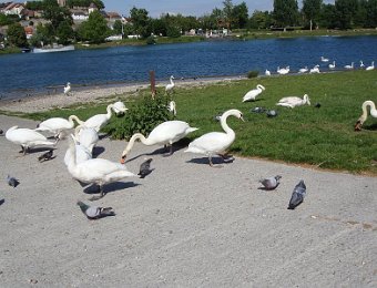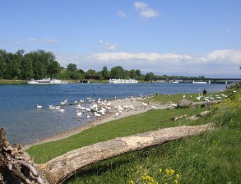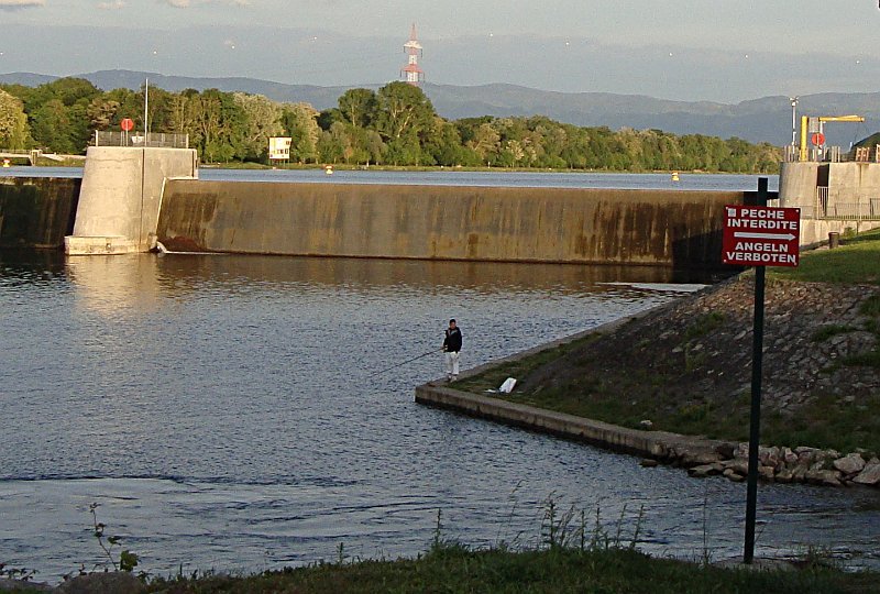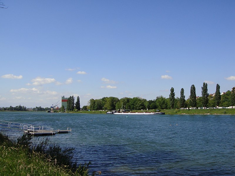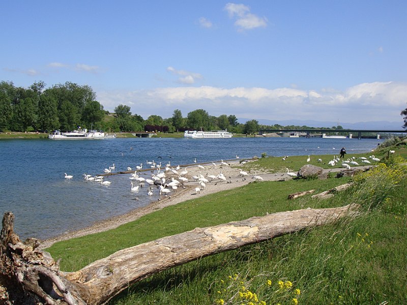 L'entrée du camping ...Très peu de monde sur le camping, en ce mois de mai.Propre et confortable. Un séjour-cuisine, deux chambres, salle de bain, toilettes.... et le mobil-home que nous avons loué.... qui n'effraient nullement les nombreux cygnes ...Vue en aval sur le Rhin ...... tout aussi indifférents aux touristes.En face, en Allemagne, Breisach.... où passent régulièrement des adeptes du ski nautique ...... où viennent pêcher les Allemands d'en face ... 2_-_Colmar4_-_Route_des_vins__Riquewihr