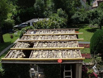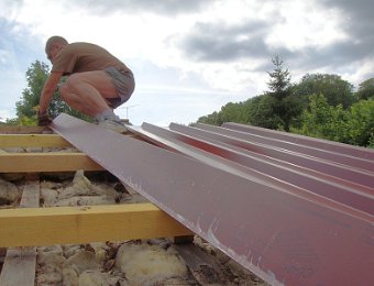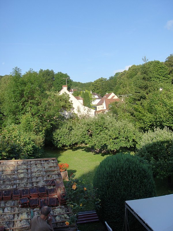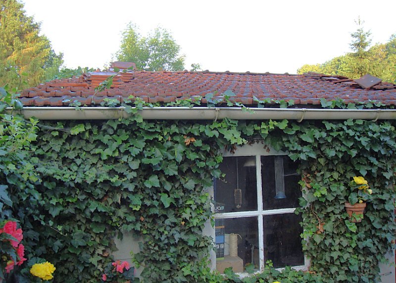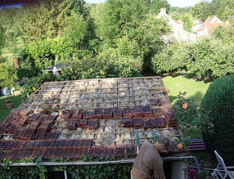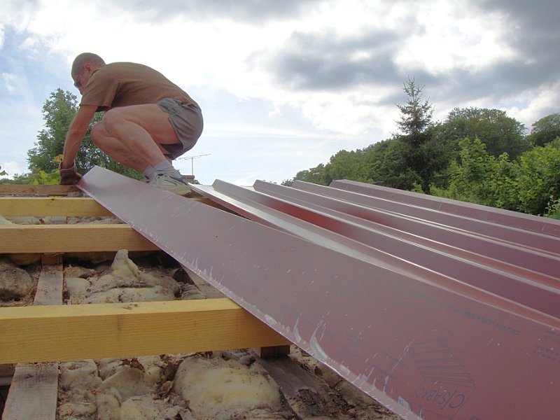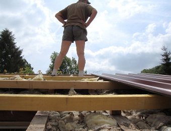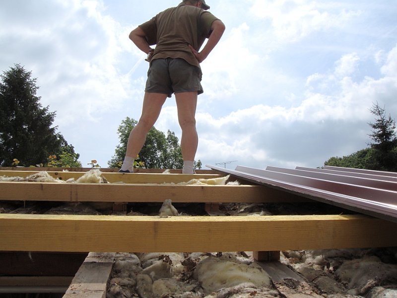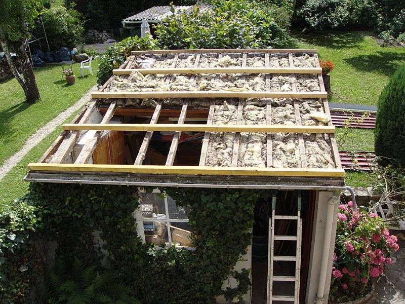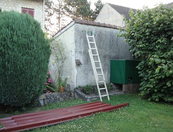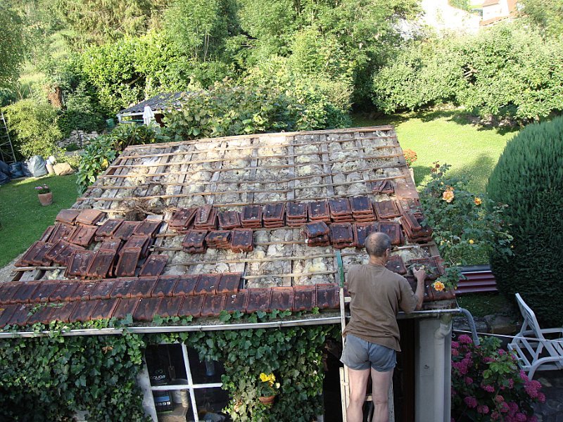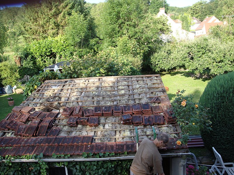 La cabane au tonton attend un toit tout neuf ...... avec ces magnifiques tôles censées être "sur mesure".Première phase : le détuilage ...... pas difficile, mais fastidieux.Heureusement, il fait beau.Comme souvent, quelques mauvaises surprises. Nous dérangeons un magnifique nid de fourmis ...... et, sous les nouveaux chevrons, il faut supprimer un panneau ...... et même plusieurs.Bon, on passe aux choses sérieuses. Monter les tôles ...... et vérifier que tout va s'emboîter. Promenades