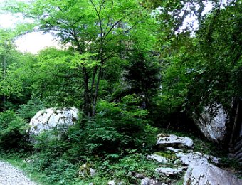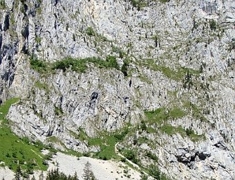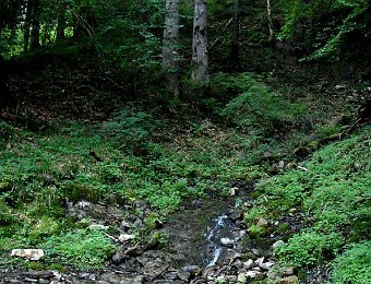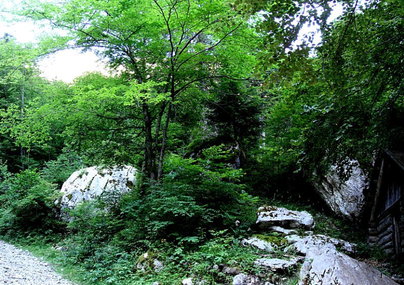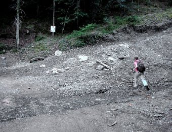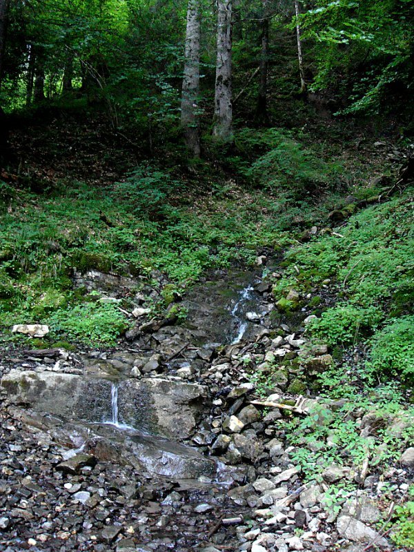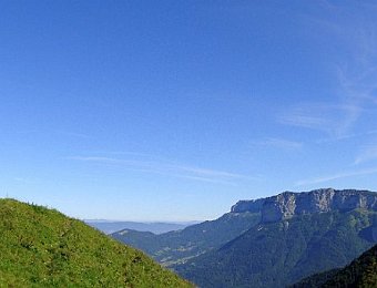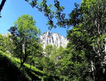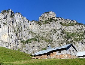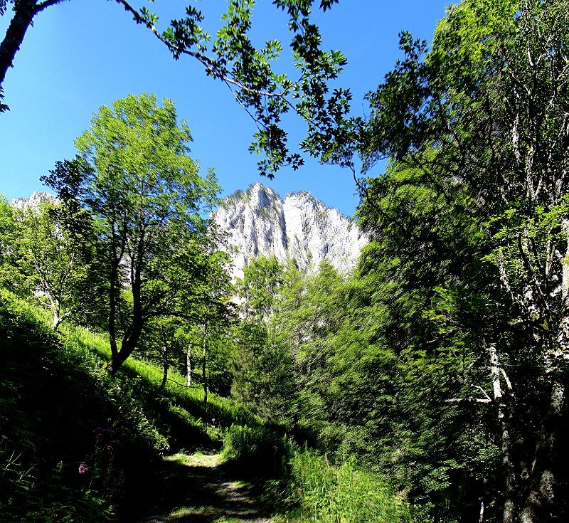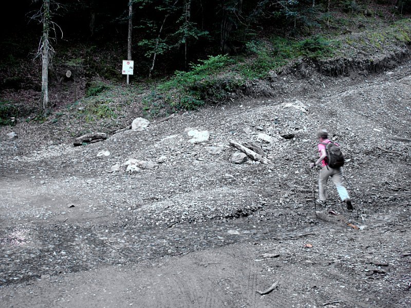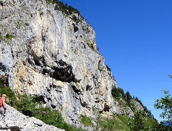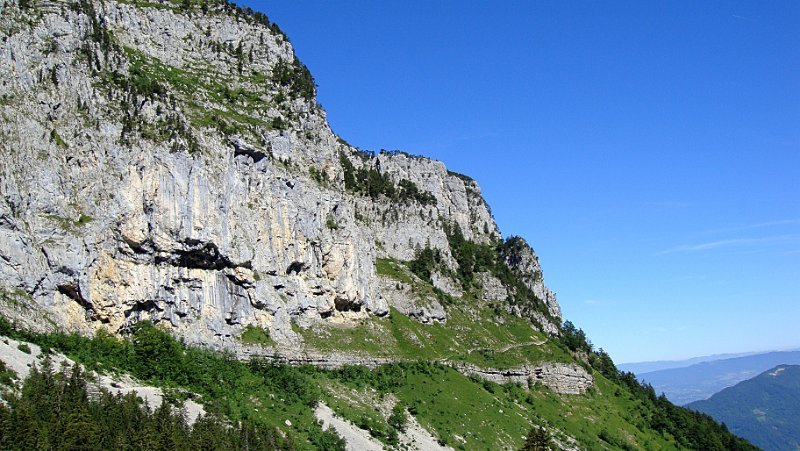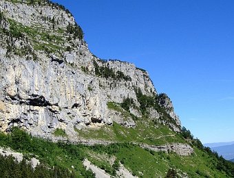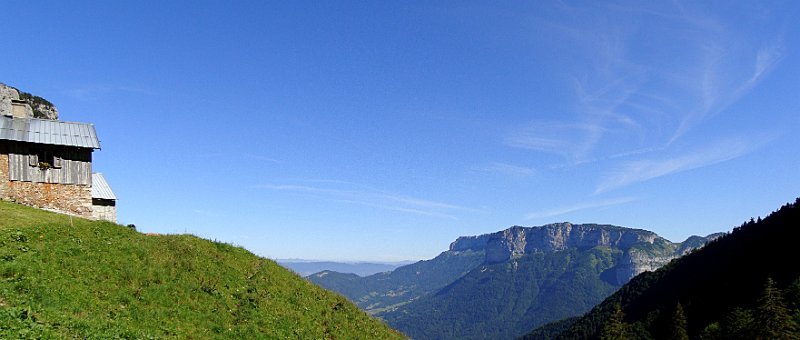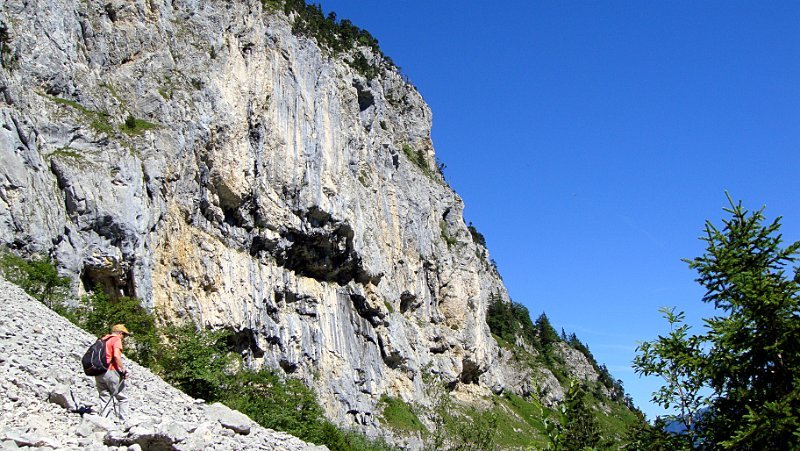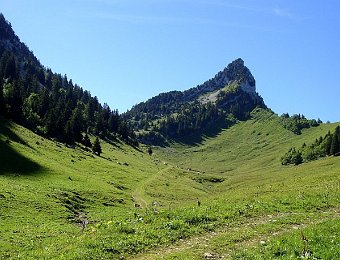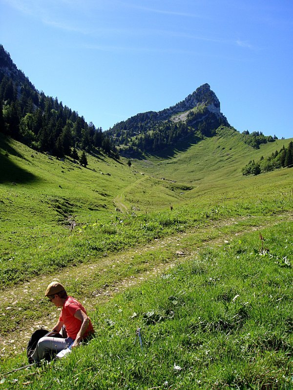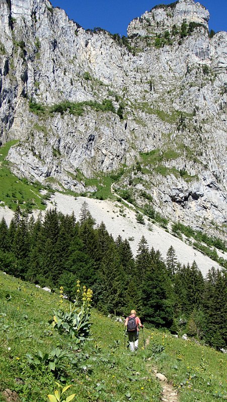 Au départ, sur le "chemin à 4x4", un peu long et monotone, ...... même si parfois agrémenté de quelques ruisseaux.Éclaircie devant le Chalet des Gardes, une cabane quasi-abandonnée, ...... et au bout d'une petite heure, premier aperçu sur les Dents.Petite halte photo. Au fond, au sud, la Roche Murra et, à l'ouest ...... le chalet de l'Aulp Riant et les Dents dans leur ensemble.À l'est, les Grandes Lanches.Sur la droite des Dents, on aperçoit le chemin vers la Pointe Nord ...... avec de nombreuses grandes gentianes jaunes ...Un petit pierrier à traverser, mais cela reste facile ...