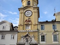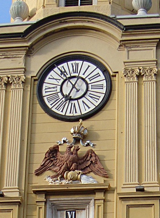 4 Sous l'horloge, les armoiries de la ville en haut-relief : une aigle bicéphale avec, contrairement à l'habitude, les deux têtes tournées du même côté. L’aigle tient une urne de laquelle coule un jet d’eau perpétuel, censé symboliser la loyauté inépuisable envers l’empereur autrichien.