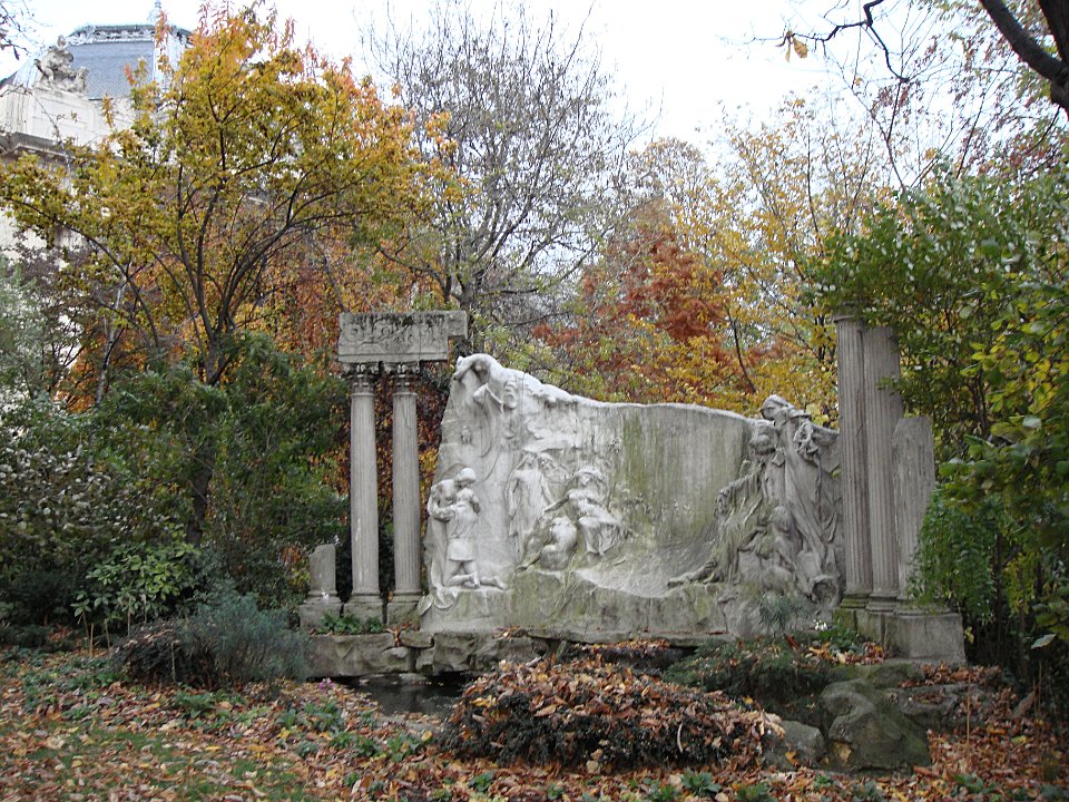 28 Devant le jardin de la Nouvelle France (anciennement vallée Suisse), place du Canada, monument à la mémoire d'Alfred Musset par le comte de Moncel de Perrin, taillé dans un seul bloc de marbre blanc