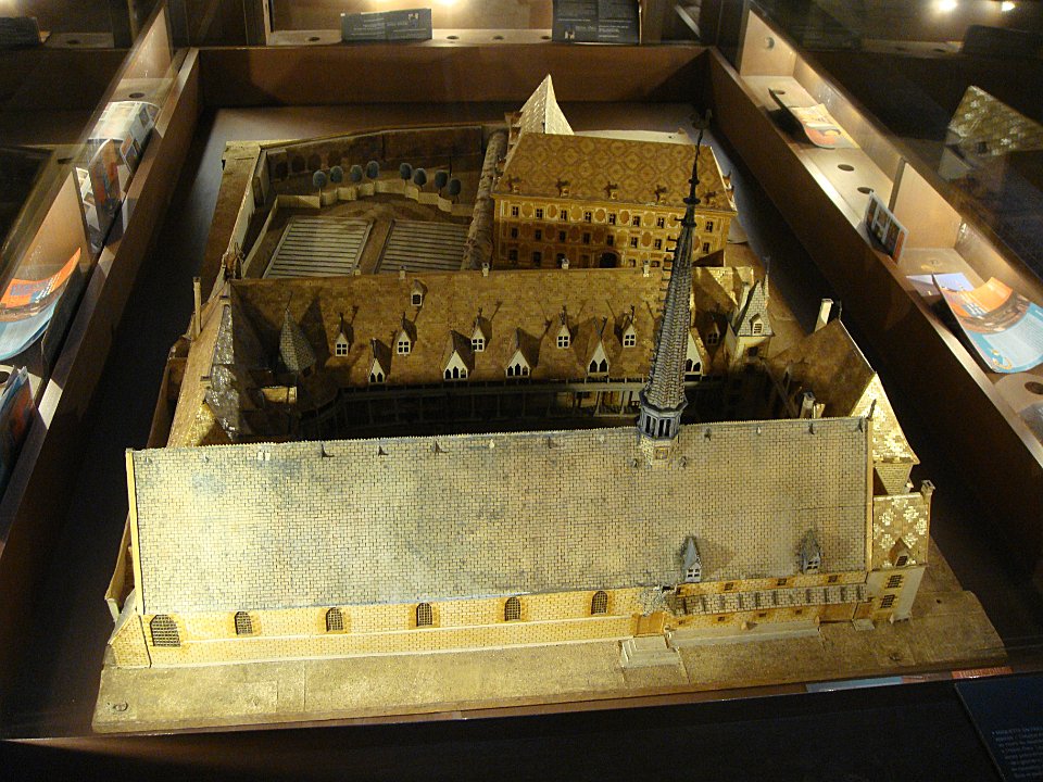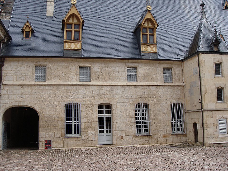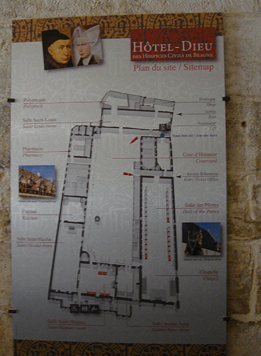7 Plan de la partie visitable : la cour intérieure et les pièces l'entourant. L'Hôtel-Dieu a été fondé au XVe siècle par le chancelier des ducs de Bourgogne Nicolas Rolin et son épouse Guigone de Salins.