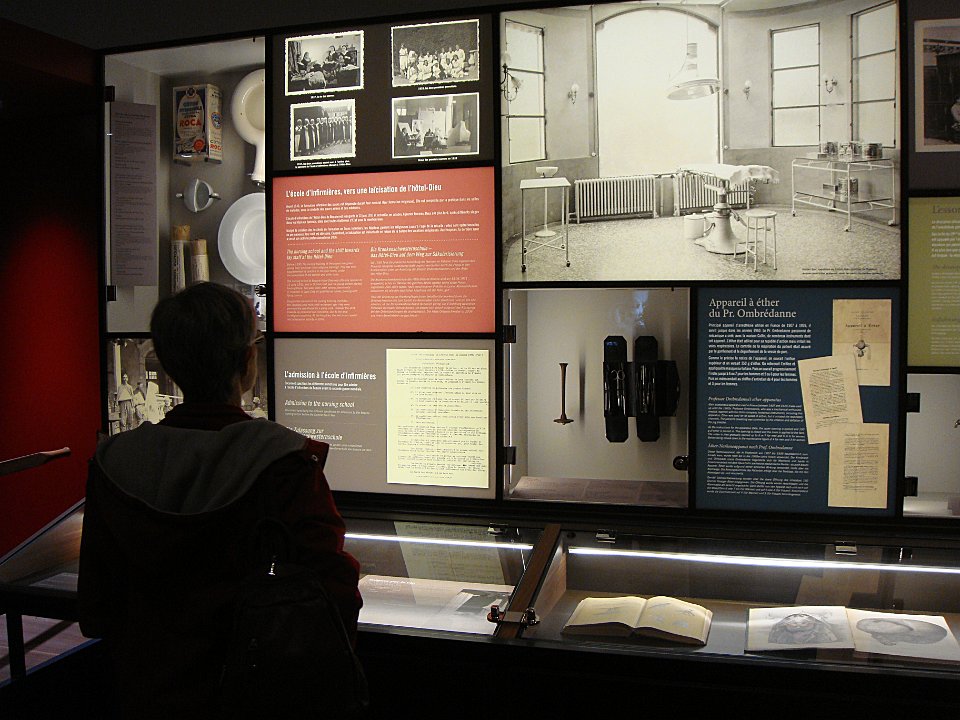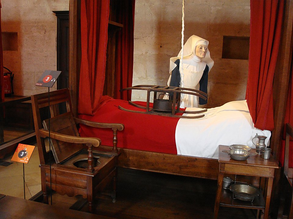 31 Des lits bien équipés, même si parfois partagés tête-bêche. (reconstitution faite au XIXe siècle). On remarque la cordelette pour aider le malade à se redresser et le tunnel de lit à chaufferette intégrée. Vaisselle en étain.