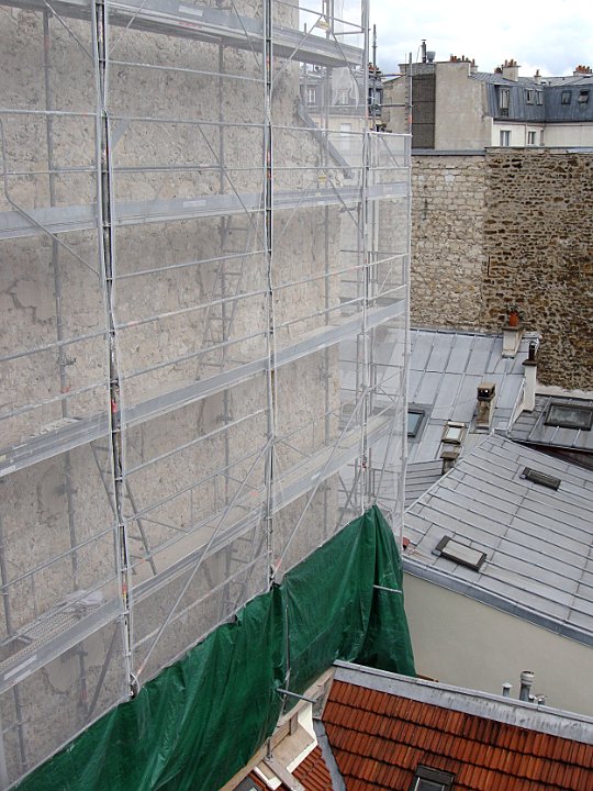 12 Sinon, sur l'immeuble à côté, réfection du mur, avec un impressionnant échafaudage reposant sur un toit en pente. |