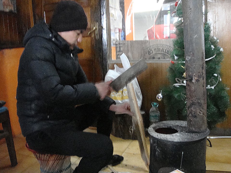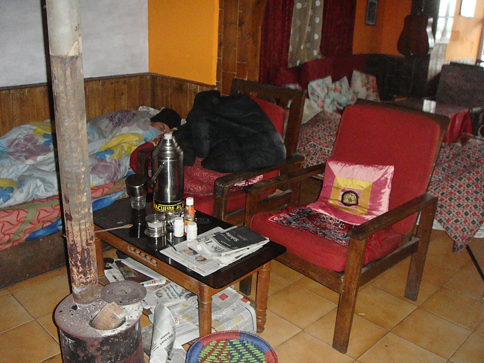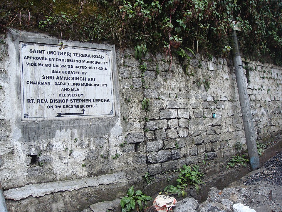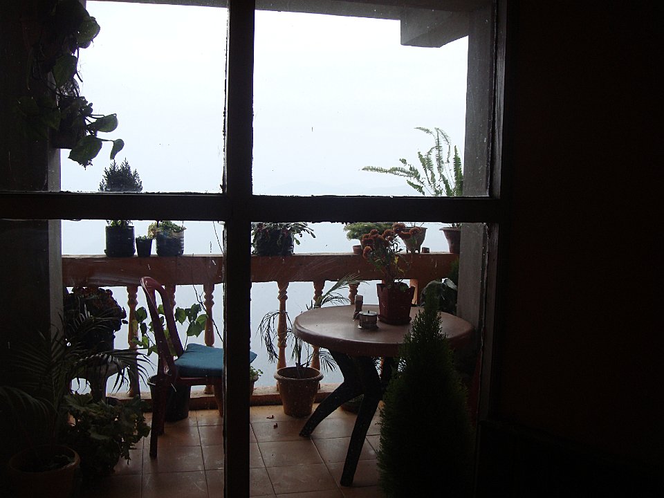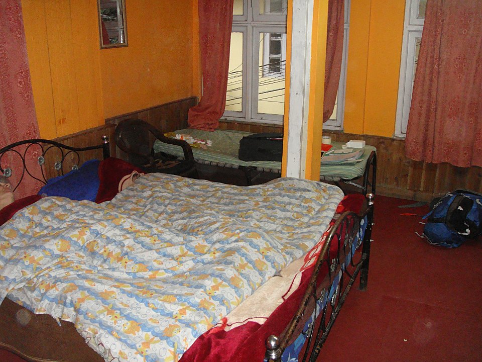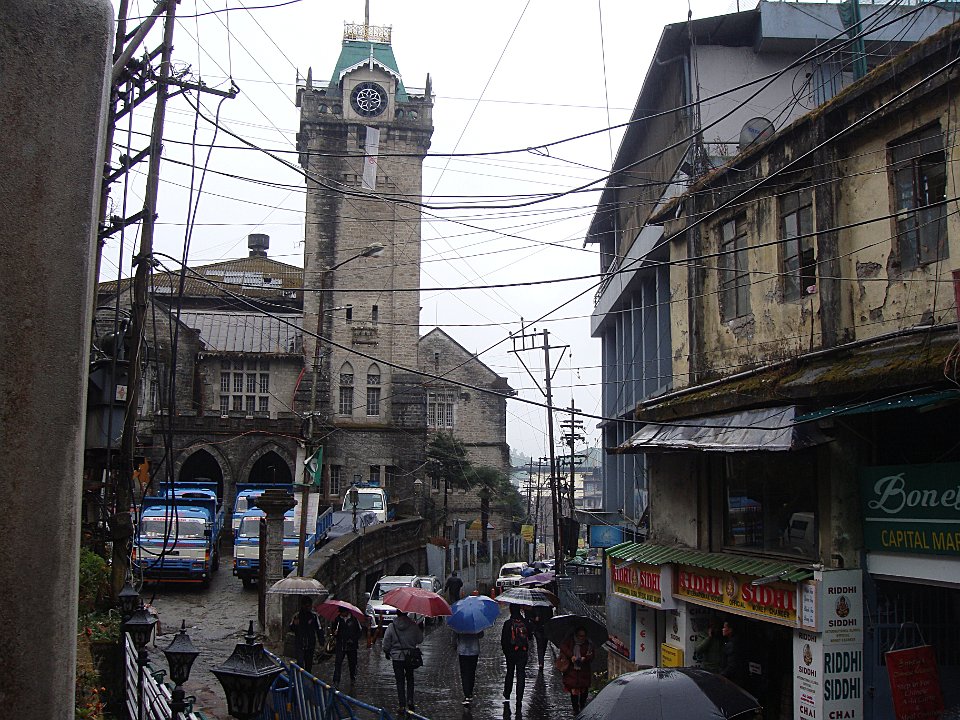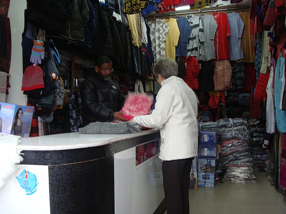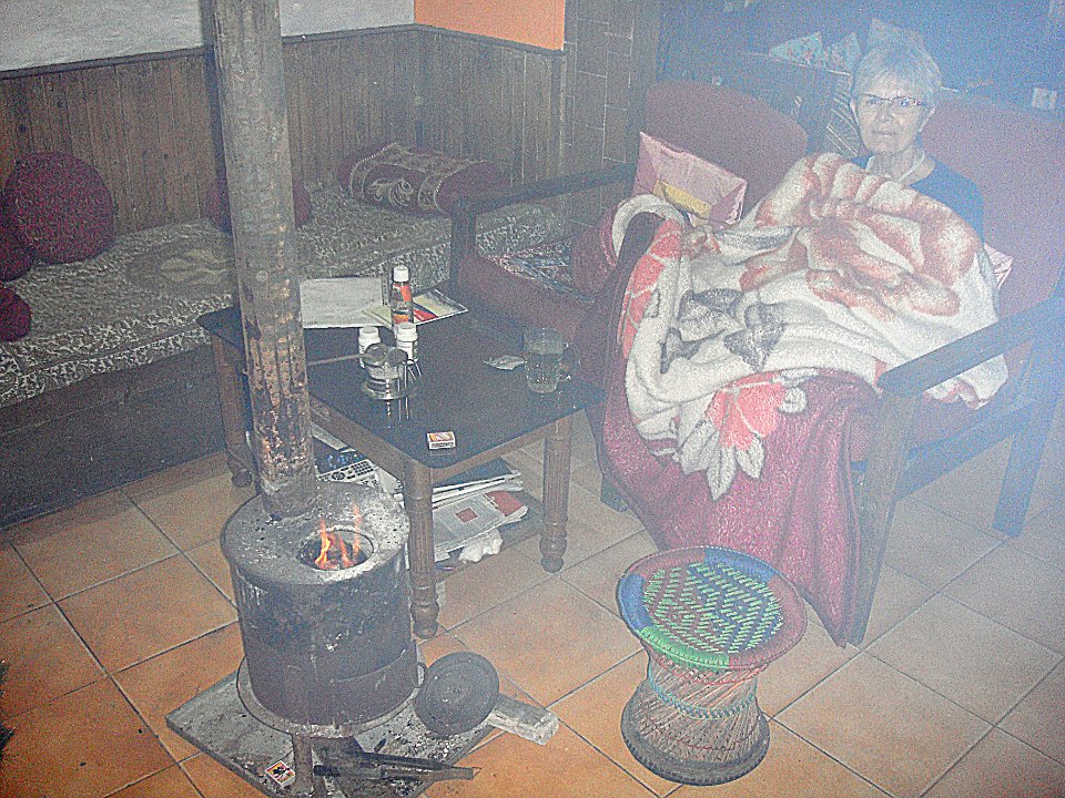 1 À l'hôtel Tower View la chambre est grande, mais il fait un froid de canard et l'eau chaude ... quelle eau chaude ?2 Quant à la vue, pour l'instant c'est plein brouillard.3 En fait les clients se réfugient près du petit poêle ...4 ... alimenté tant bien que mal ...5 ... et dont le tirage est peu efficace.6 Balade le lendemain. Ici, la rue qui monte à l'hôtel. Et il pleut.7 On n'échappe pas à la Mère Teresa, mais ça fait un bon point de repère.8 Dans la rue commerçante nous changeons facilement nos euros en roupies ...9 ... et Martine craque pour quelques habits. Elle prendra entre autres un manteau bien moletonné !10 Bon, il y a aussi le centre commercial pour touristes que l'on retrouve partout. Darjeeling (train)Bhubaneswar