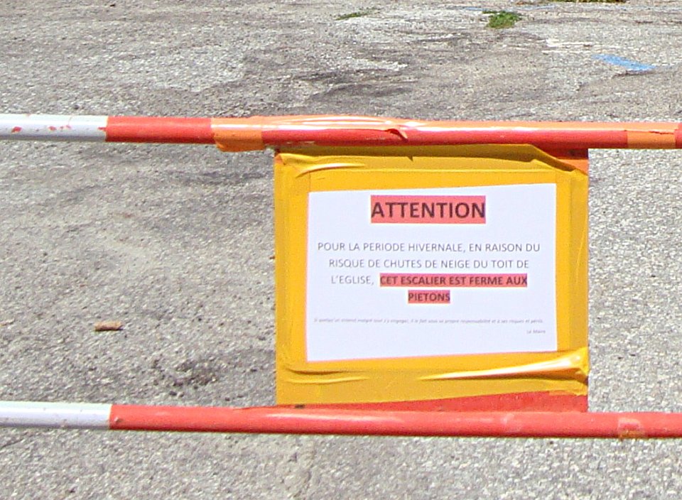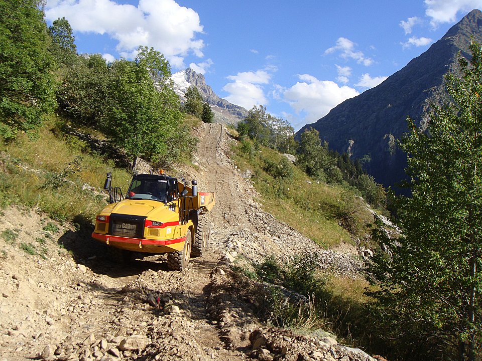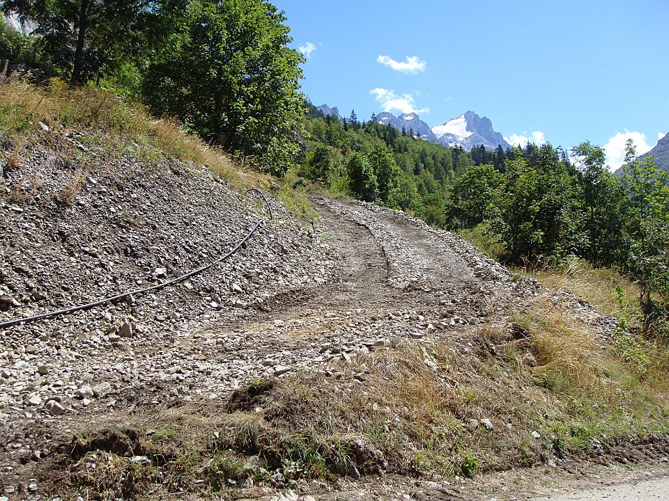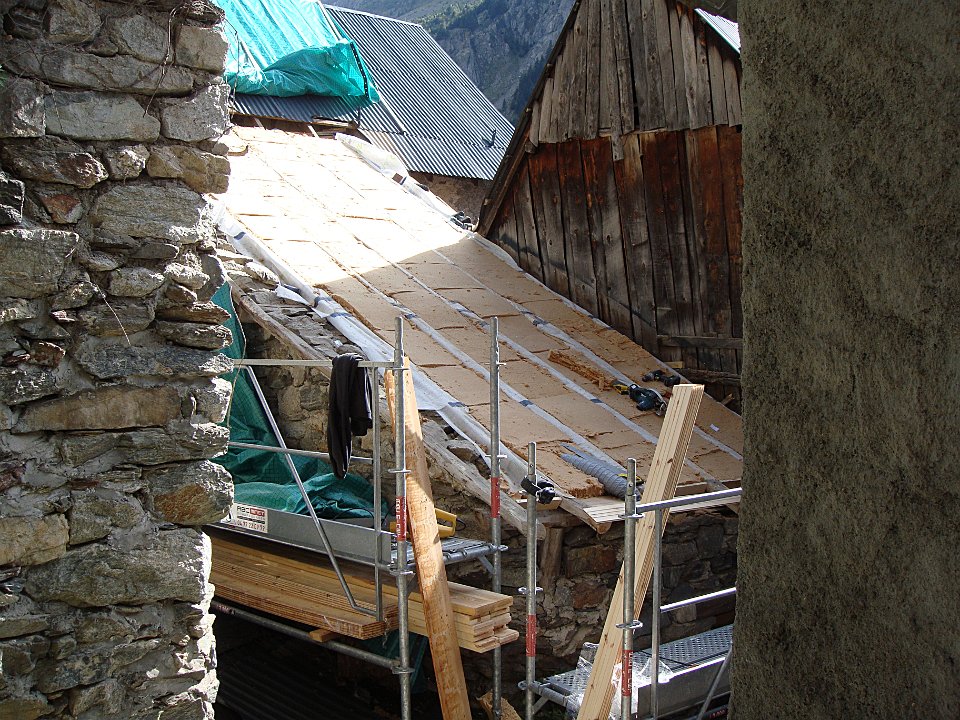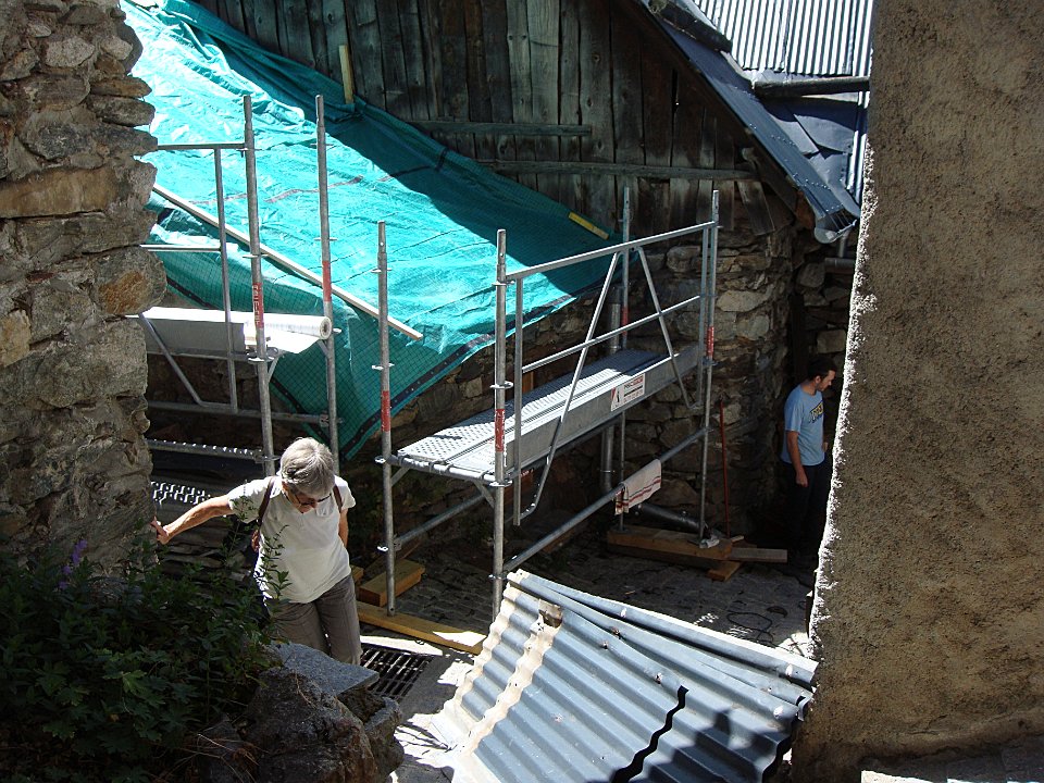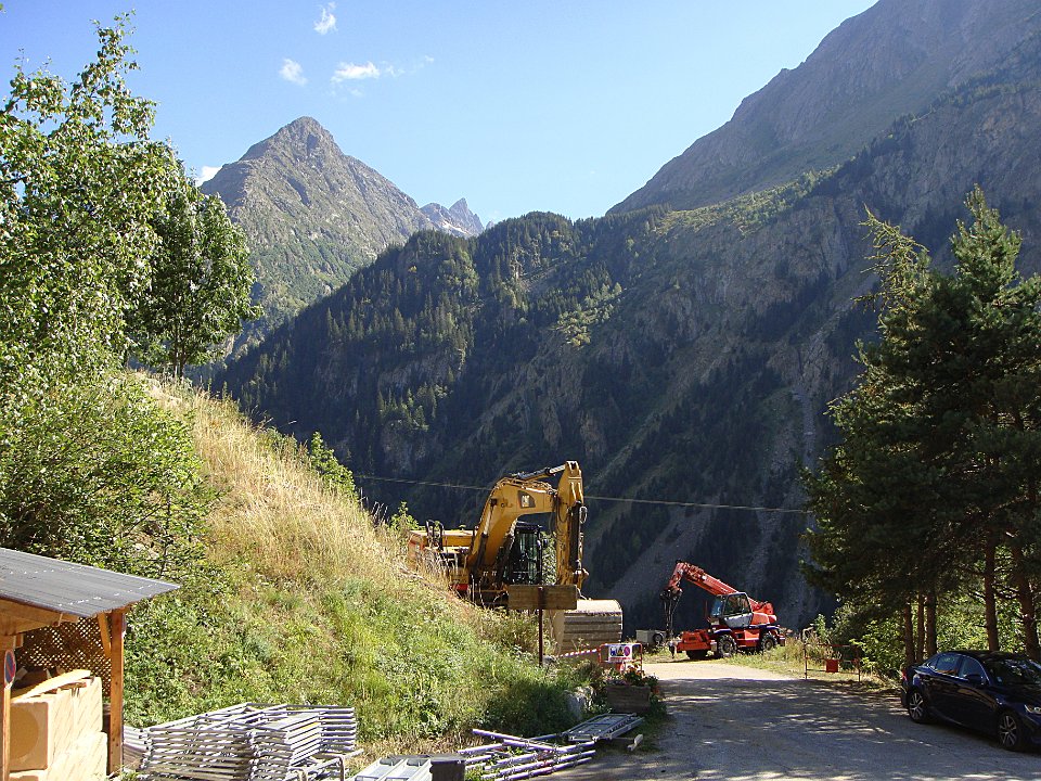 1 Terrassements en cours, pour dévier les chutes de pierres.2 Bon, le panneau n'est pas vraiment à jour !3 Gros engins de chantier ...4 ... pour créer un chemin d'accès ...5 ... afin d'aller plus haut ...6 ... et réaliser une plateforme, un redent, puis, plus tard, un grand talus en terre et rochers.7 Autres travaux à plus petite échelle : réfection d'un toit. Ici le jour de notre arrivée ...8 ... et trois jours plus tard.9 Question toit, Gérard et Blandine ont fait refaire celui de leur maison.10 Départ et trajetRepas, famille
