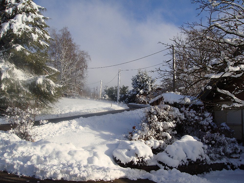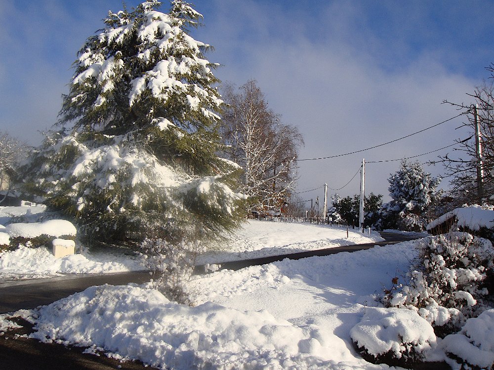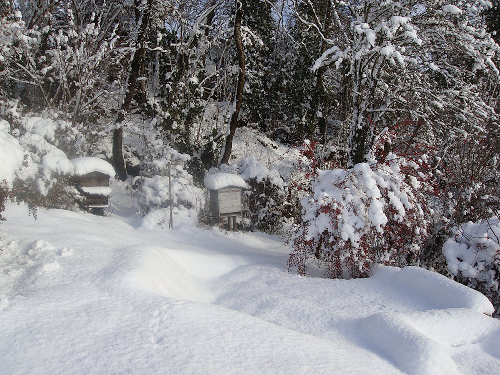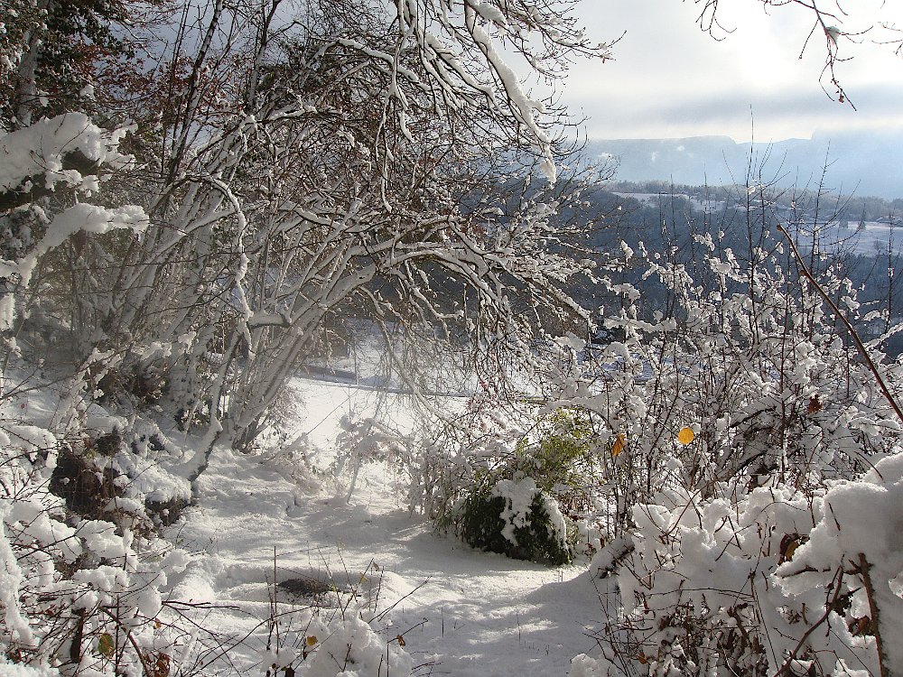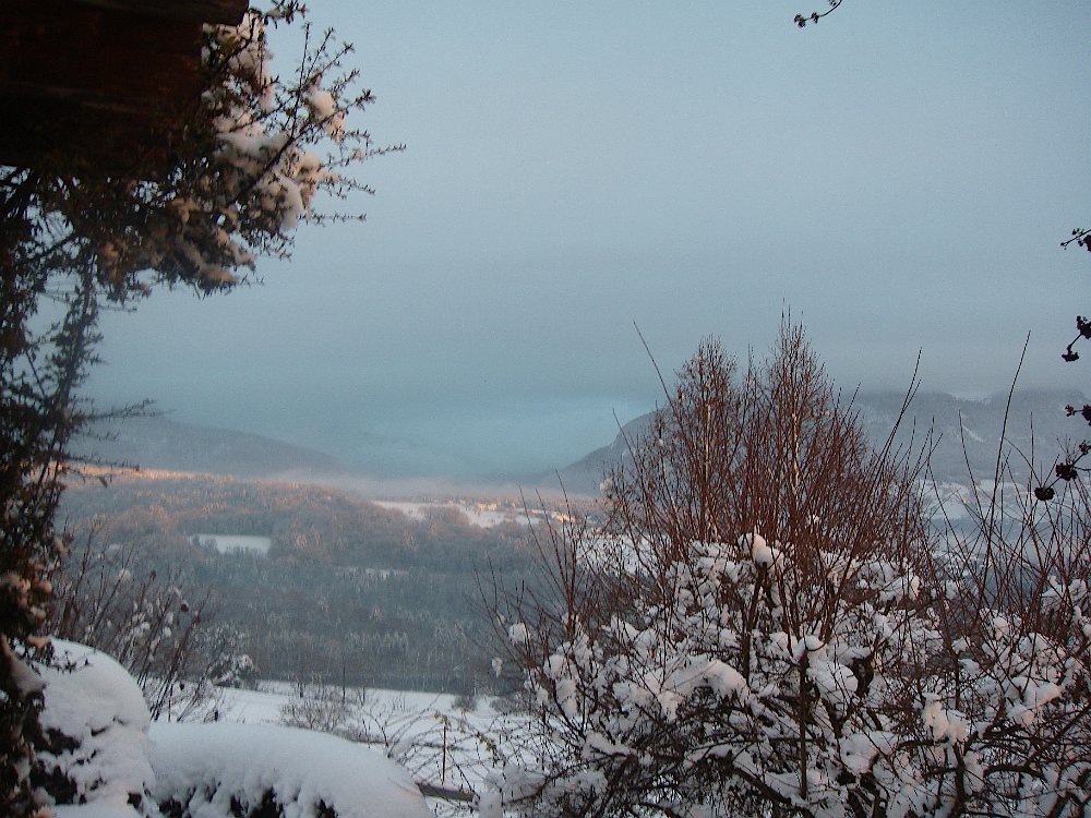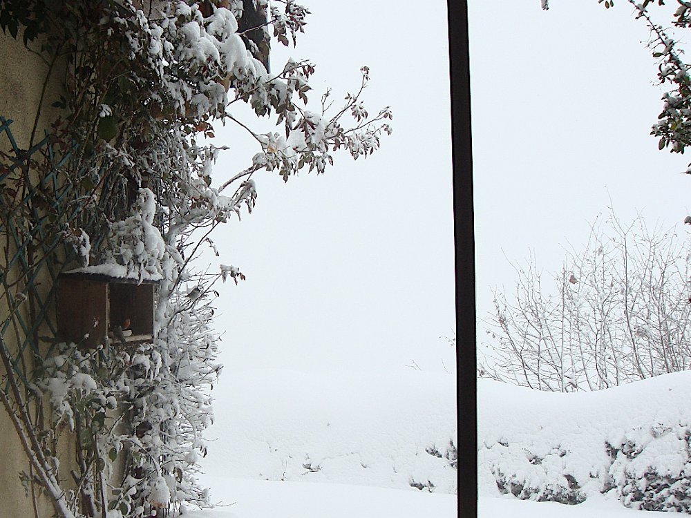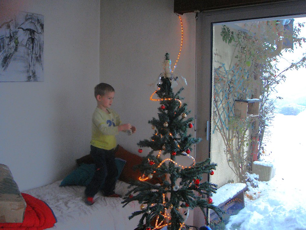 Neige abondante ... ... et rouge-gorges affamés ... ... mais au chaud à l'intérieur. Le temps s'améliore, l'occasion ... ... de quelques photos alentours ... La cabane du noyer, avec son nouveau chapeau. Derrière la maison. Quelques feuilles jaunissantes résistent. Les ruches, toujours vides ... ... attendent le printemps ... ... comme le cotonaster callypige. Mais déneigement et soleil dégagent la route ... ... et le chemin d'accès ... ... vers le garage. Pour la maison, effort minimum : juste un sentier vers la porte d'entrée. Grand beau maintenant, ... sauf à Annecy, enfoui sous la brume, au loin au pied du Semnoz. Brume qui s'étend d'ailleurs le soir, veille du jour des cadeaux ... ... en prévision duquel Arthur a aidé pour le sapin. Encore une petite boule ici ...