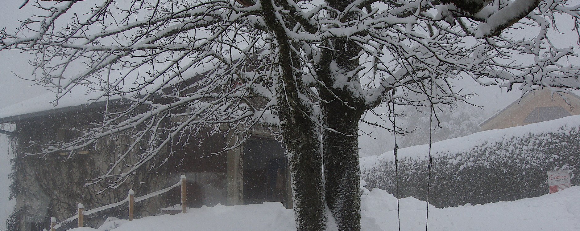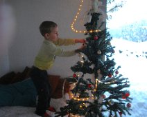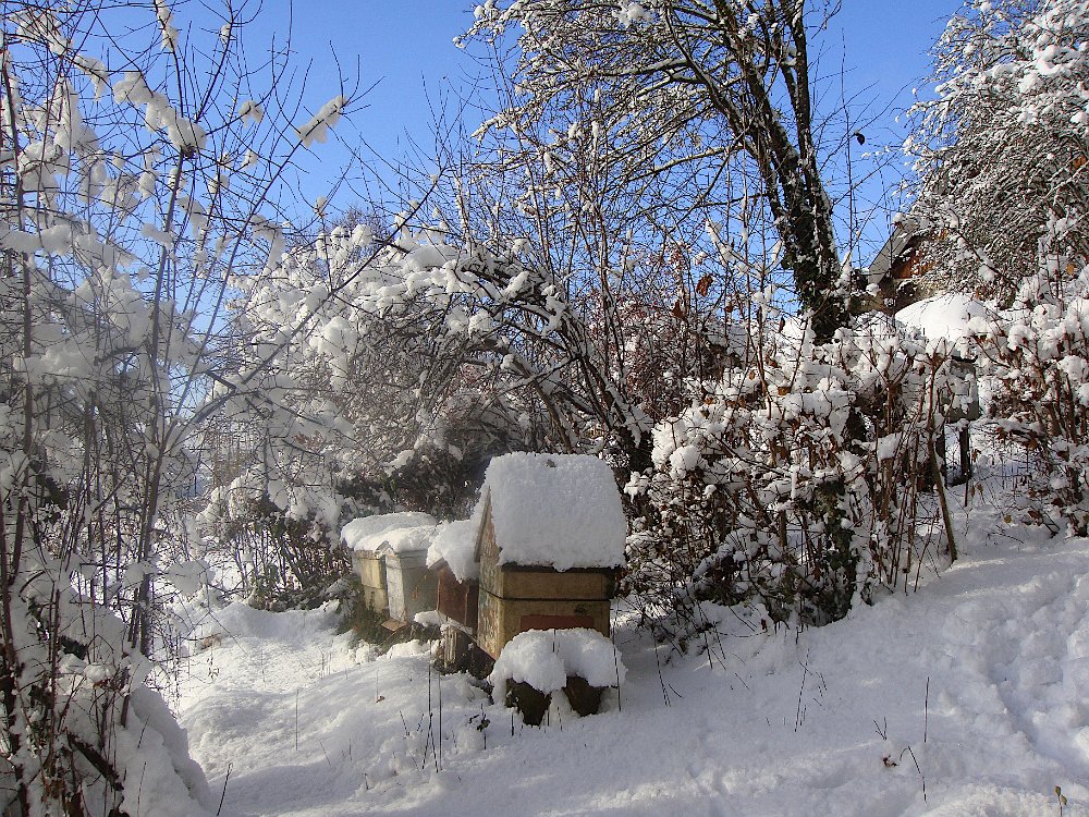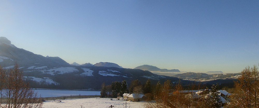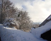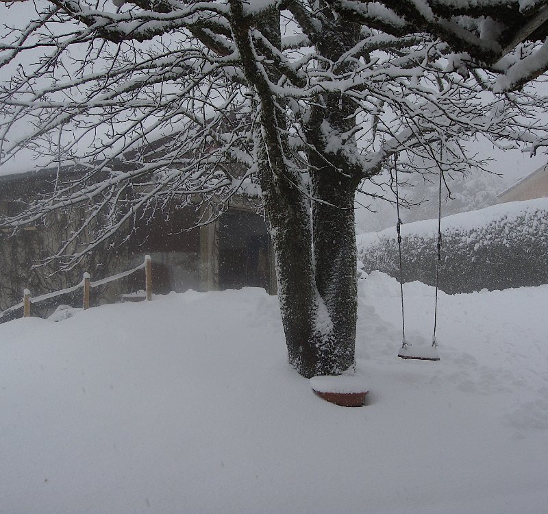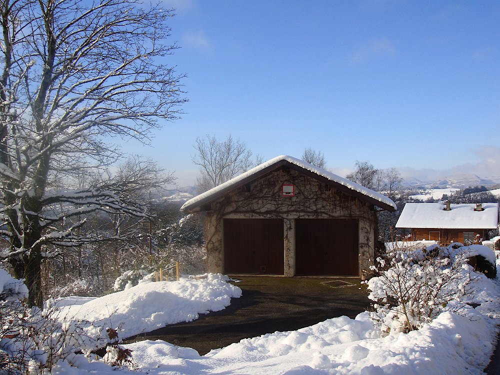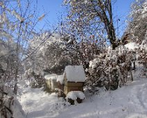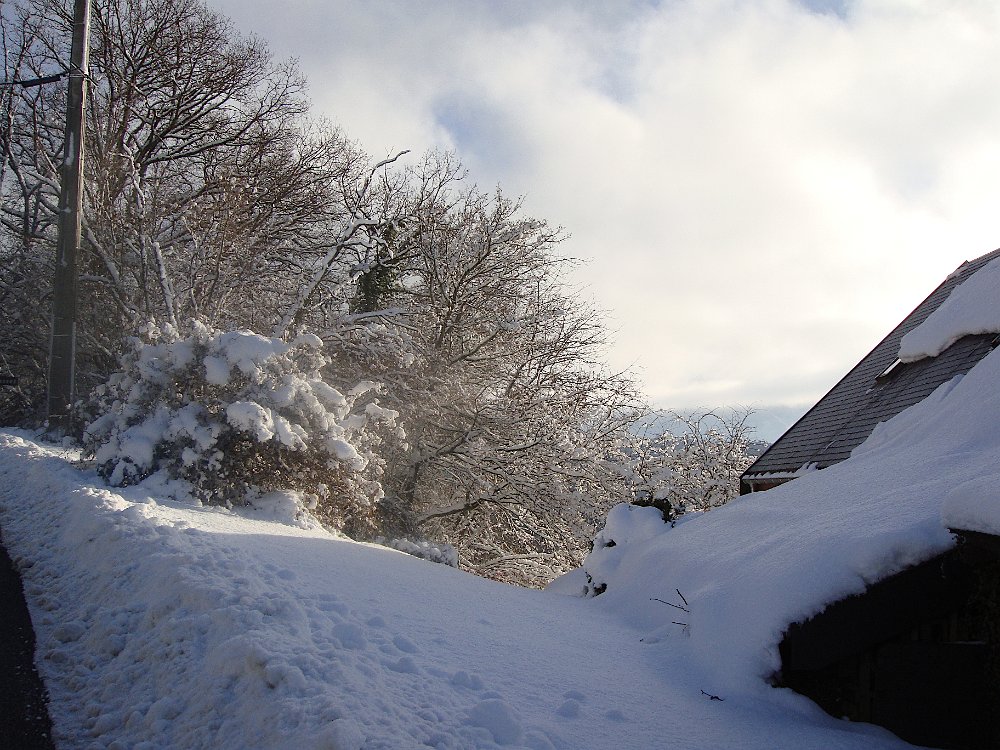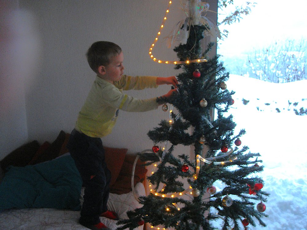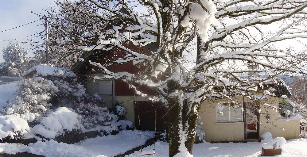 Neige abondante ... ... et rouge-gorges affamés ... ... mais au chaud à l'intérieur. Le temps s'améliore, l'occasion ... ... de quelques photos alentours ... La cabane du noyer, avec son nouveau chapeau. Derrière la maison. Quelques feuilles jaunissantes résistent. Les ruches, toujours vides ... ... attendent le printemps ... ... comme le cotonaster callypige. Mais déneigement et soleil dégagent la route ... ... et le chemin d'accès ... ... vers le garage. Pour la maison, effort minimum : juste un sentier vers la porte d'entrée. Grand beau maintenant, ... sauf à Annecy, enfoui sous la brume, au loin au pied du Semnoz. Brume qui s'étend d'ailleurs le soir, veille du jour des cadeaux ... ... en prévision duquel Arthur a aidé pour le sapin. Encore une petite boule ici ...