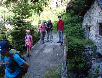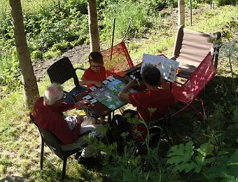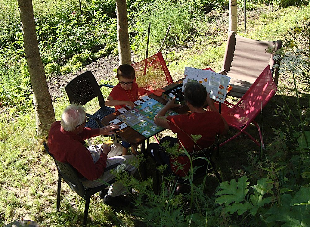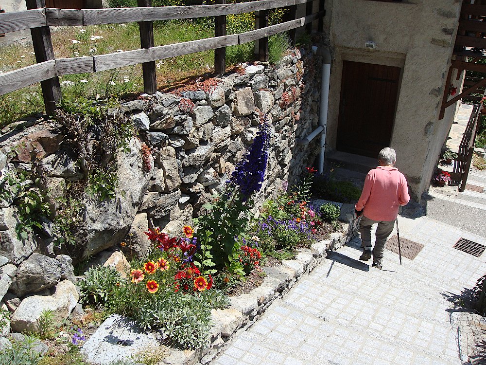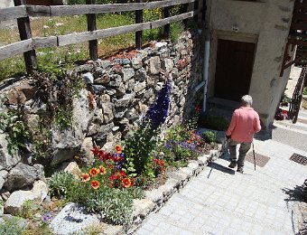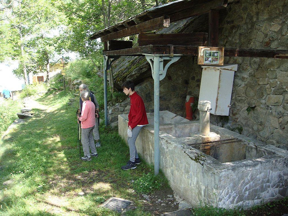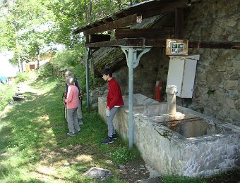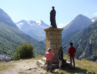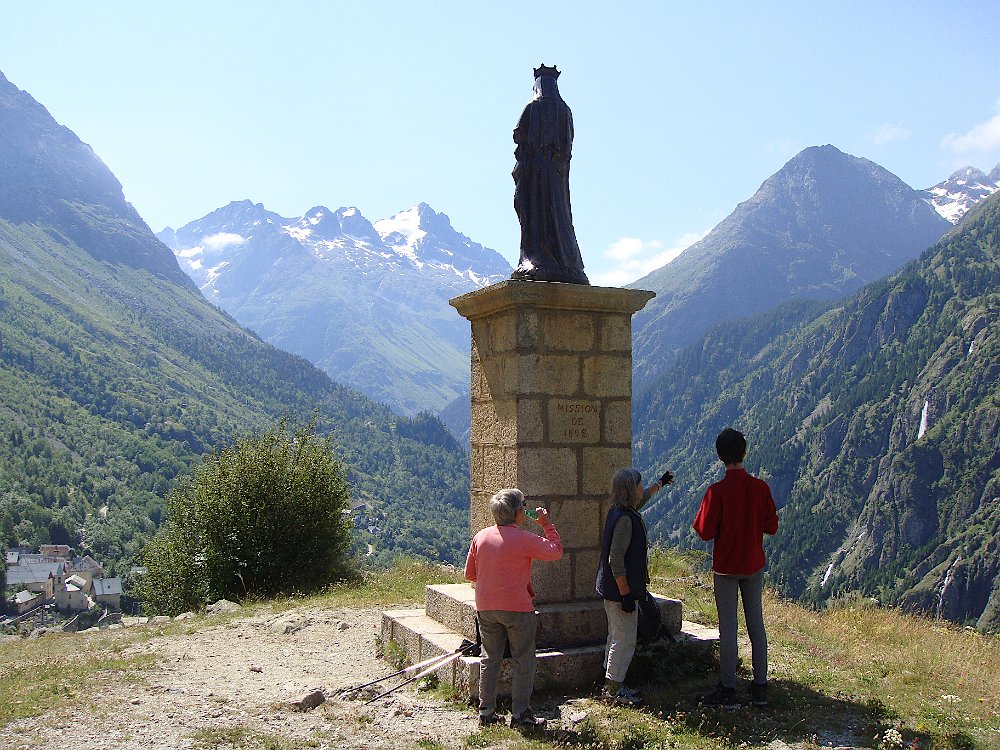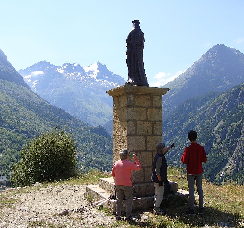 Via le Moulin du Diable Martine, Marie-Claude, Alban rêvant sans doute d'échecs. Repérages panoramiques au pied de la Vierge du Collet Nous allons un peu plus loin. En face, on devine Lanchâtra. Demi-tour au lavoir juste avant le Puy ... ... et retour. Vue sur la Bernardière. Descente fleurie vers Saint-Christophe ... ... son cimetière et son église. Au passage, ne dérangeons pas Jean-Paul et Anne, fort occupés par Jean. Aller et arrivéeLe Clot