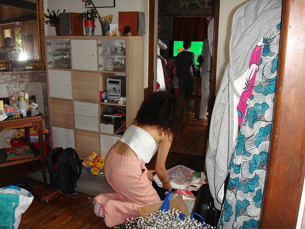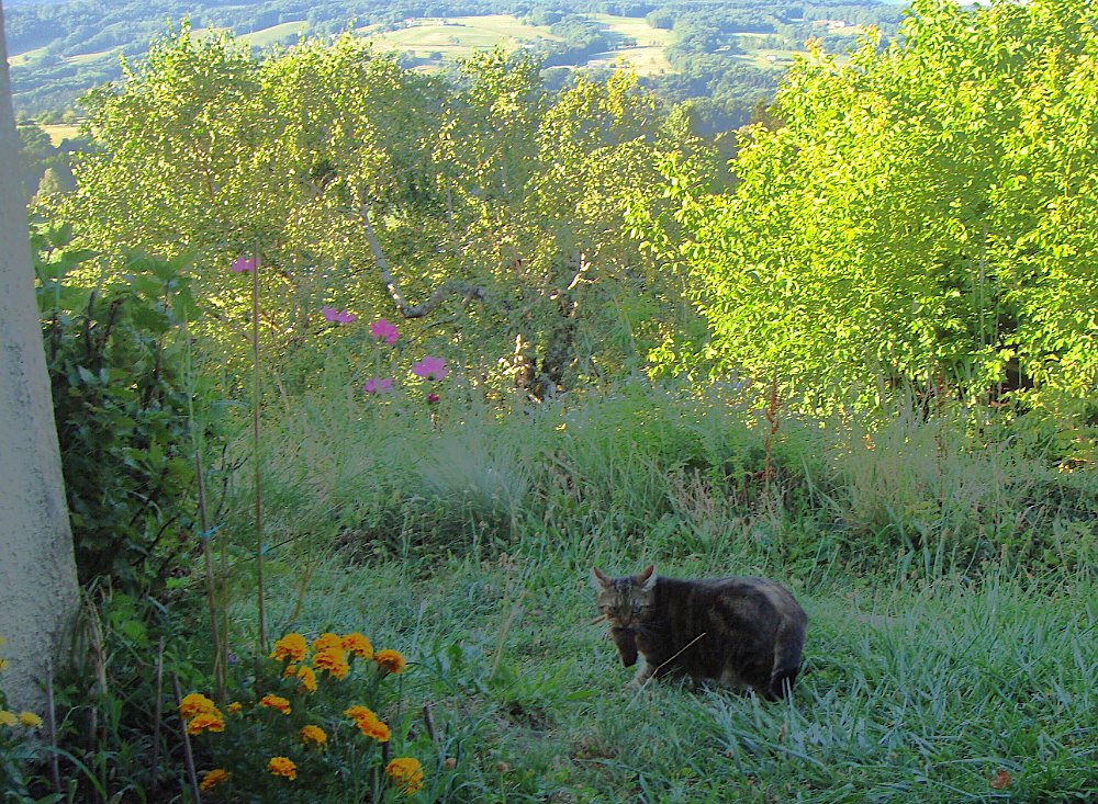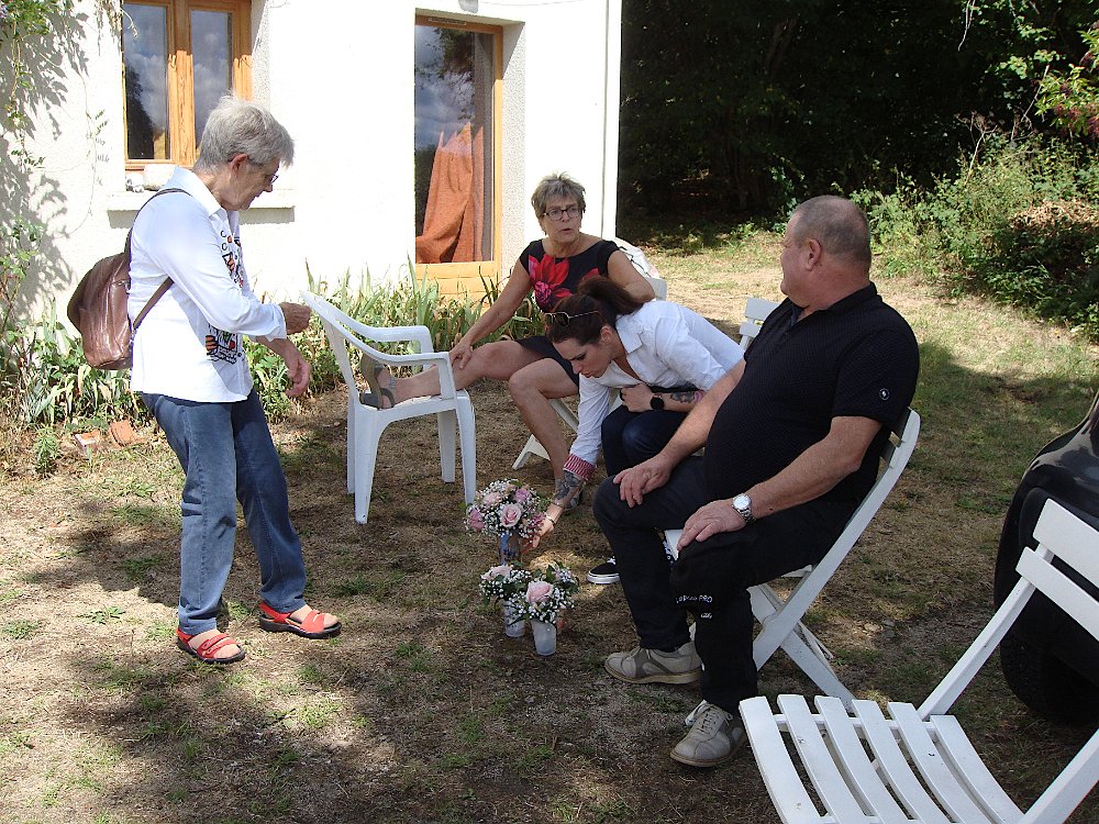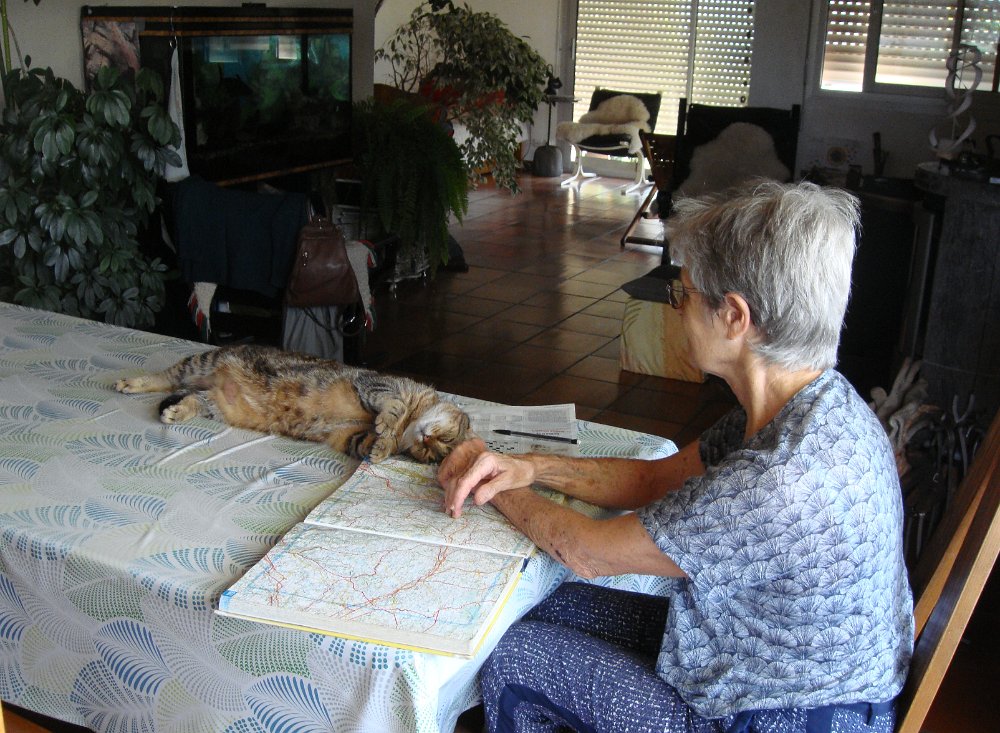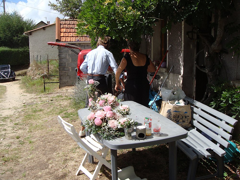 Pas de pluie depuis un bon moment. Les plantes souffrent.Les jeunes reines fourmis vont s'envoler.Les araignées prolifèrent. Ici une épeire fasciée, sur le bassin ...... où il reste encore un peu d'eau.Koschka en profite pour chasser ...... puis, le devoir accompli, se reposer pendant que Martine regarde le trajet vers l'Auvergne.Nous arrivons d'abord à Arconsat. Pas de doute, c'est bien là.Tout est prêt.Enfin, presque. Labels La fête