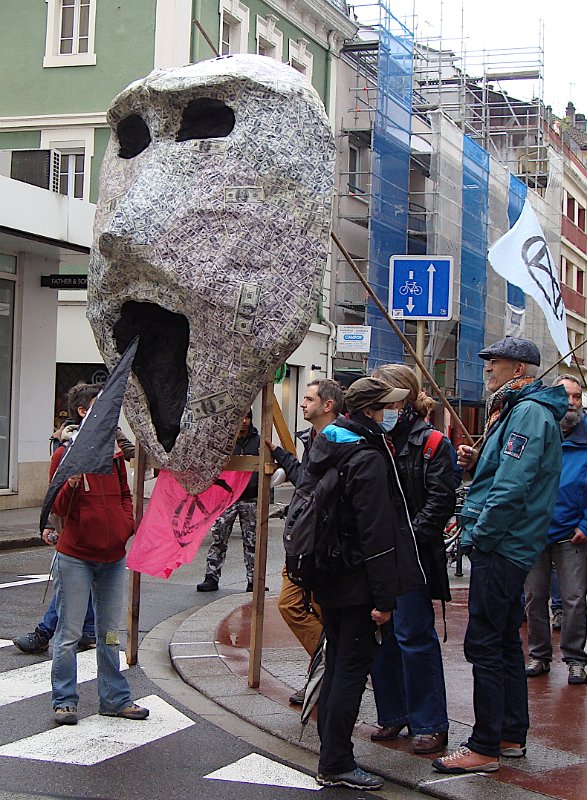 Un groupe anar, avec une sculpture en dollars et, curieusement, un parano qui met un masque. Contre la Covid ? Ou, naïvement, pour ne pas se faire repérer ?