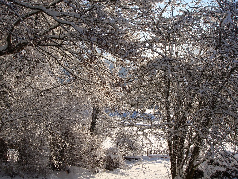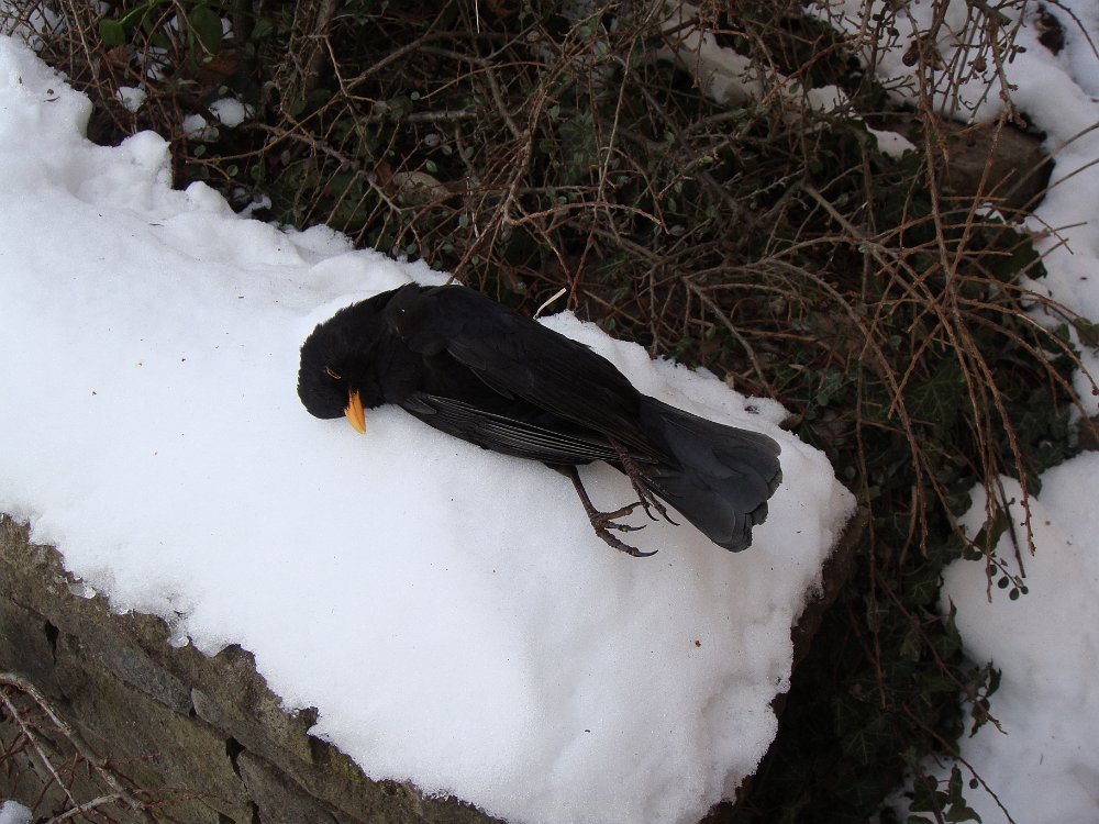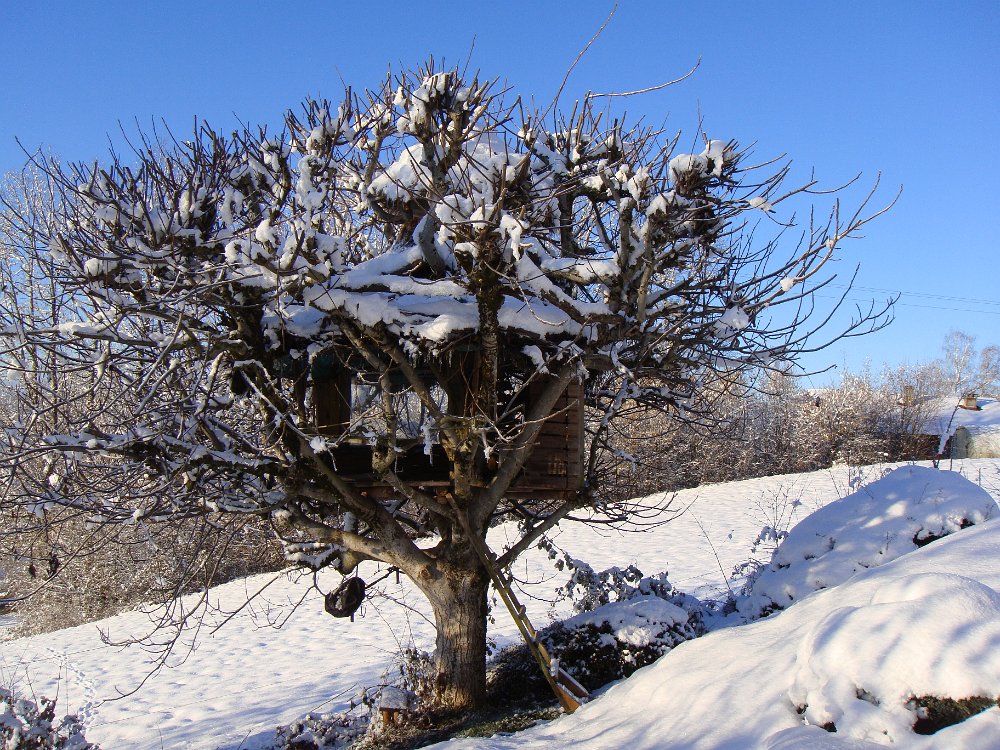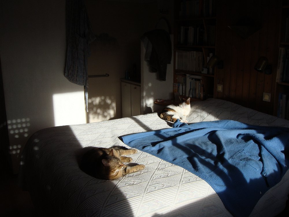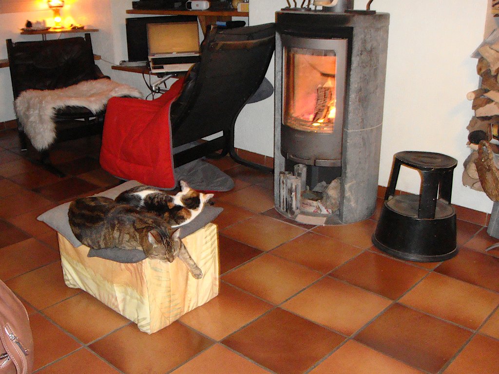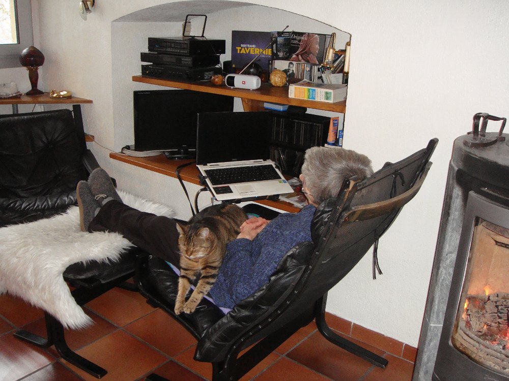 Beau, mais froid.Au fond du jardin, dentelles de neige.La cabane dans le noyer résiste bienCe merle s'est assommé contre une vitre. Mort gelé.Les jours sont courts mais dès le matin ...... on peut somnoler au soleil.L'après-midi aussi ...... et le soir, devant le poêle ......ou sur des genoux accueillants.Début mars, plus de neige. Certains en profitent pour brûler des déchets ... Labels