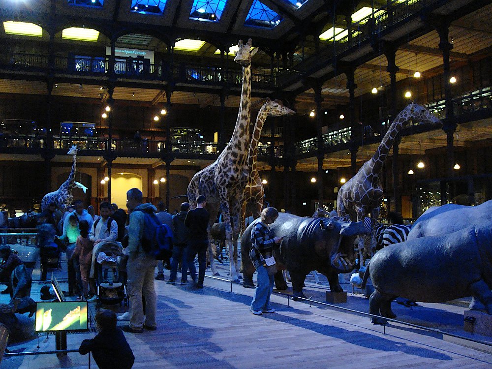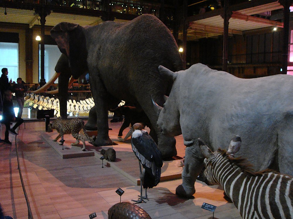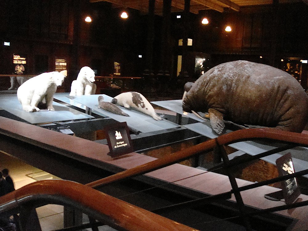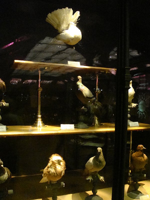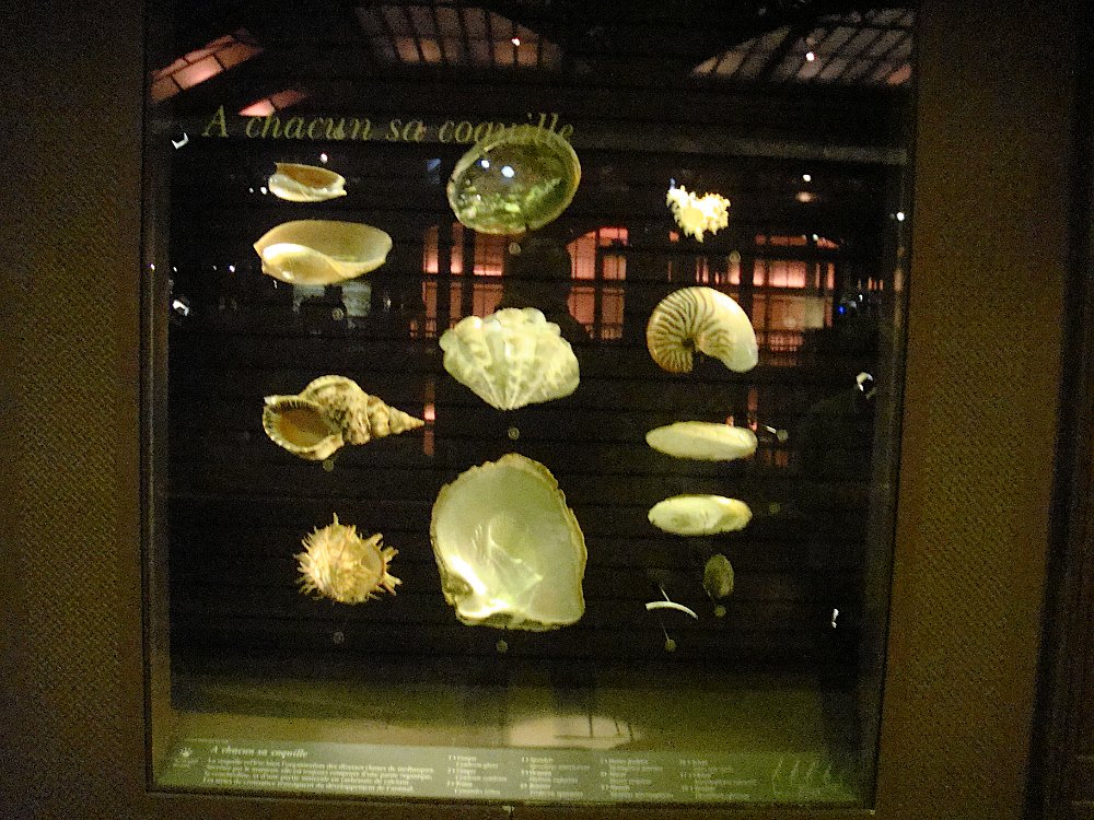 En fait l'entrée « moderne », moins prestigieuse, se trouve sur le côté gauche ...... mais, bien sûr, Darwin est à l'honneur.Les vieux squelettes font toujours leur petit effet ...... ainsi que les animaux africains ...... ou autres. Naturalisés ou reproductions ?Là, pas de doute, c'est un faux calmar.Mais les enfants s'intéressent plus aux vidéos. D'ailleurs c'est dimanche et ils sont un peu trop nombreux et bruyants !Les oiseaux, eux, sont certainement naturalisés ...... en particulier ce pigeon paon qui domine fièrement la vitrine.Et, bien sûr, les coquillages sont des vrais : conque, nacre, bénitier, nautile etc. Labels Trocadéro, aquarium
