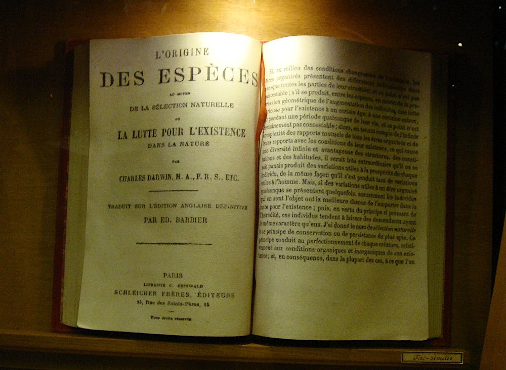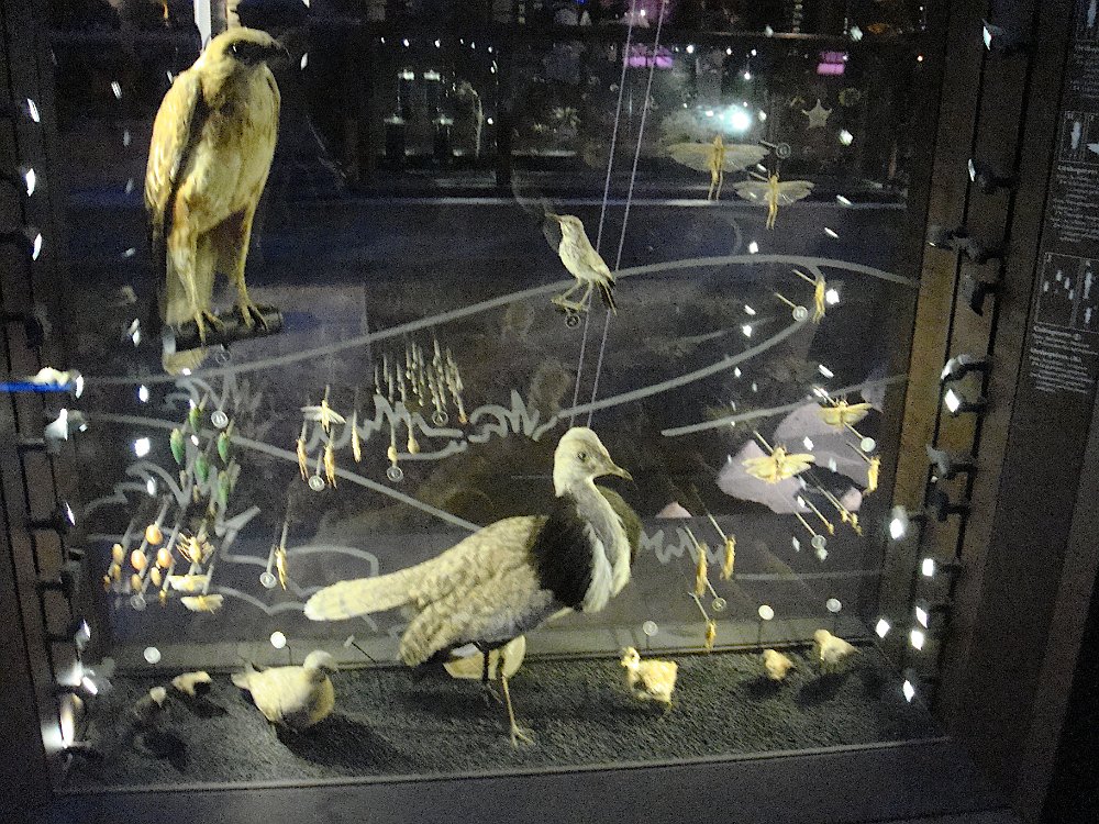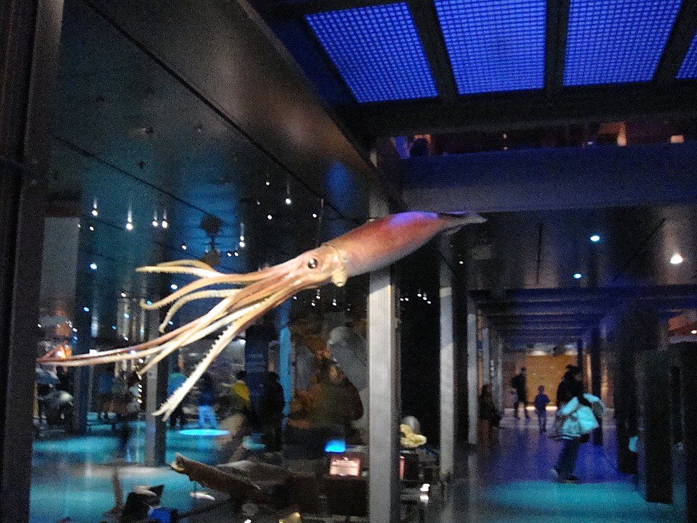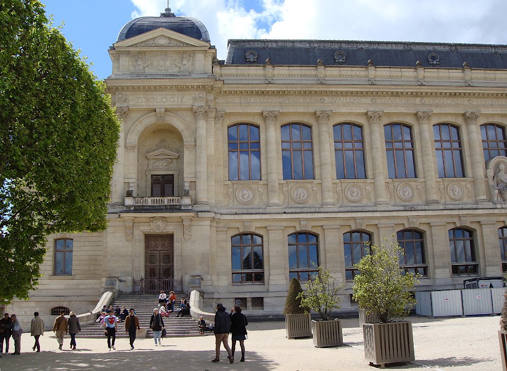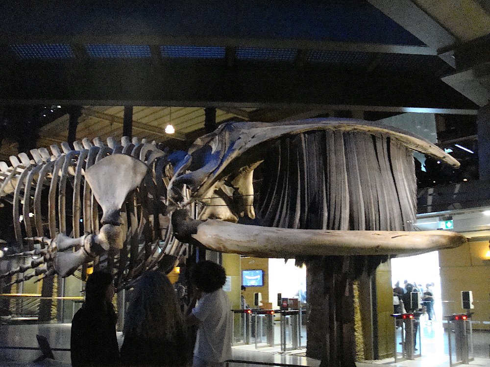 En fait l'entrée « moderne », moins prestigieuse, se trouve sur le côté gauche ...... mais, bien sûr, Darwin est à l'honneur.Les vieux squelettes font toujours leur petit effet ...... ainsi que les animaux africains ...... ou autres. Naturalisés ou reproductions ?Là, pas de doute, c'est un faux calmar.Mais les enfants s'intéressent plus aux vidéos. D'ailleurs c'est dimanche et ils sont un peu trop nombreux et bruyants !Les oiseaux, eux, sont certainement naturalisés ...... en particulier ce pigeon paon qui domine fièrement la vitrine.Et, bien sûr, les coquillages sont des vrais : conque, nacre, bénitier, nautile etc. Labels Trocadéro, aquarium