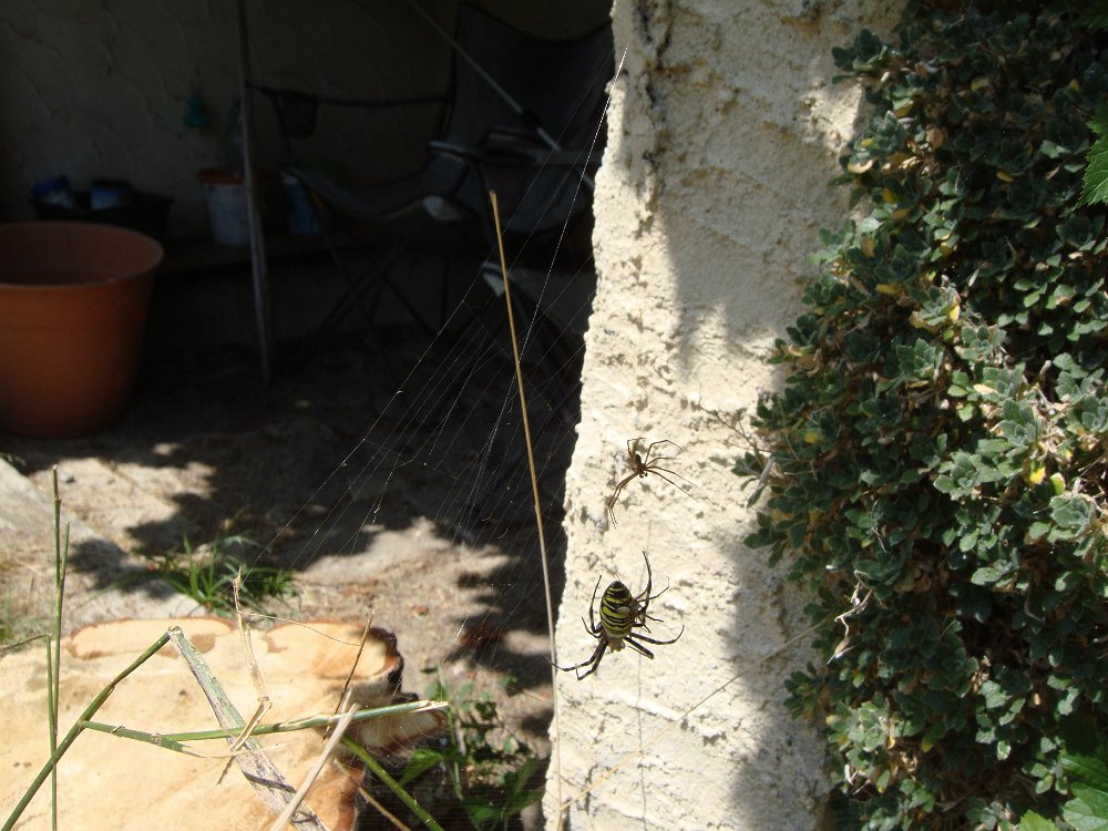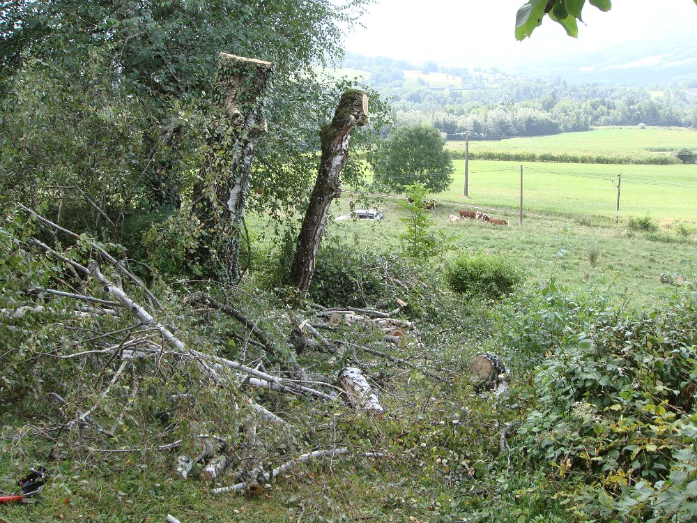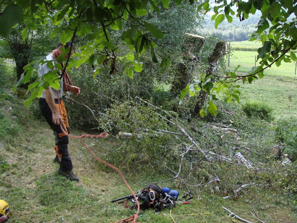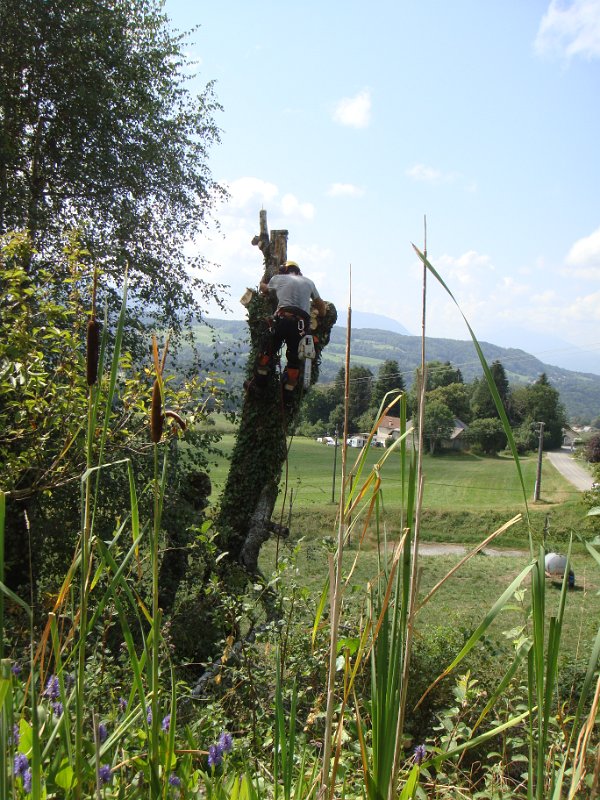 Euthanasie de bouleaux par Pierre, notre voisin élagueur. Inspection ...... puis action.Dernière grosse branche.Fin de la taille. Ne reste plus ...... qu'à ranger le matériel ...... et à débarrasser le chantier ...... avec l'aide d'Arthur ...... qui va ensuite tenter de pêcher le canard en plastique dans le bassin, ...... ce qui ne trouble ni la belle épeire ni ses petits. Labels