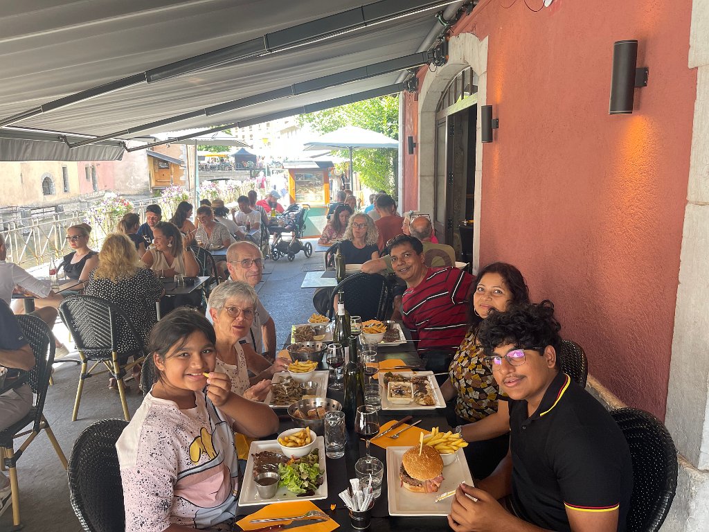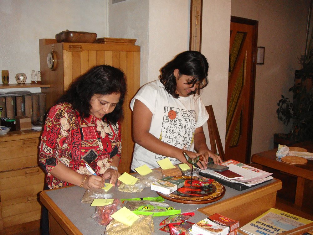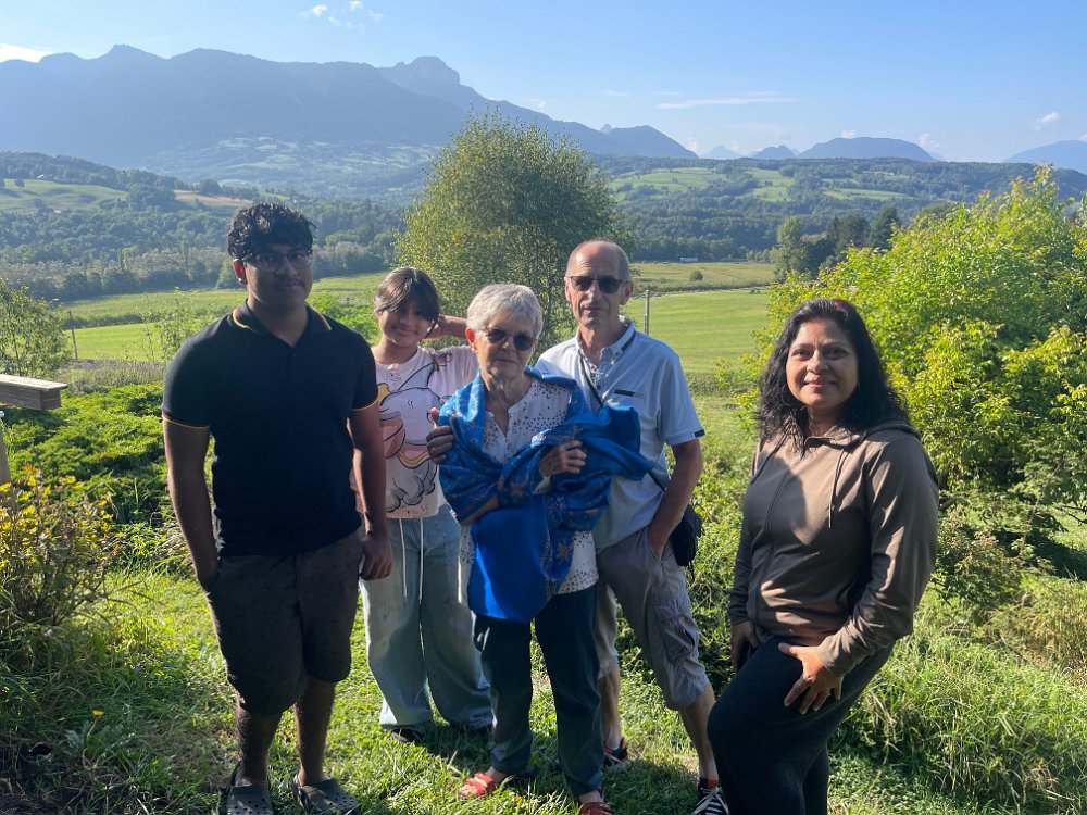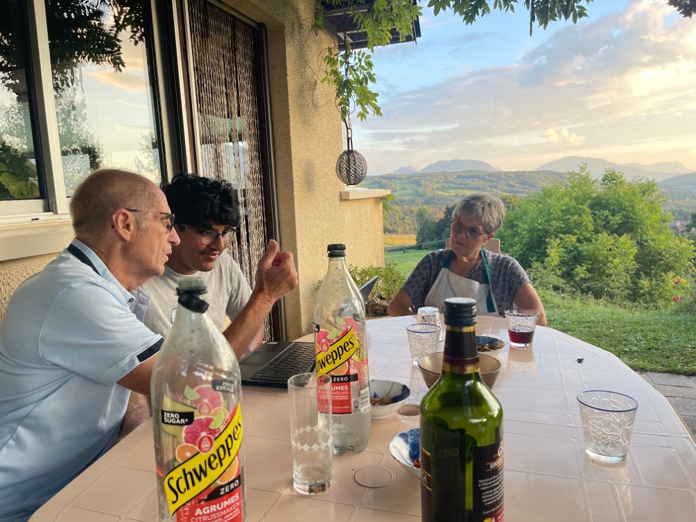 Arrivée le soir à Groisy depuis Paris, en voiture de location.Déballage des cadeaux. Un superbe châle en cachemire et une flopée d'épices.La plupart nous sont inconnues. Urmi et Adrija écrivent les noms ...... et avant l'apéro nous donnent des conseils d'utilisation.Adrija a 13 ans aujourd'hui ! Cela mérite bien le fameux tiramisu de Martine ...... et un cadeau fait en commun avec Abhi: une BD en anglais.Cela semble lui convenir !Notez le t-shirt « à la française » !Un peu de discussion mathématique avec Agnibho, avant son entrée à l'X Palaiseau.Dans le jardin. Par chance la météo s'est trompée : il fait beau. Labels