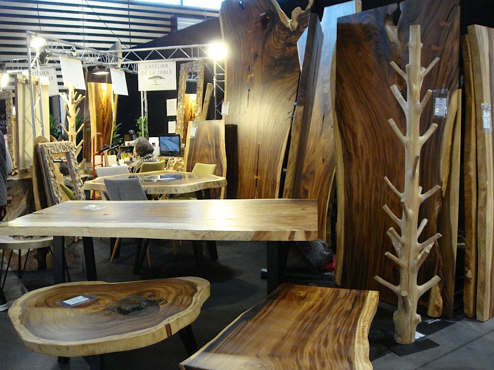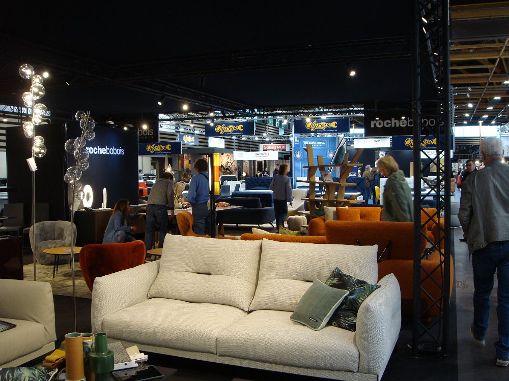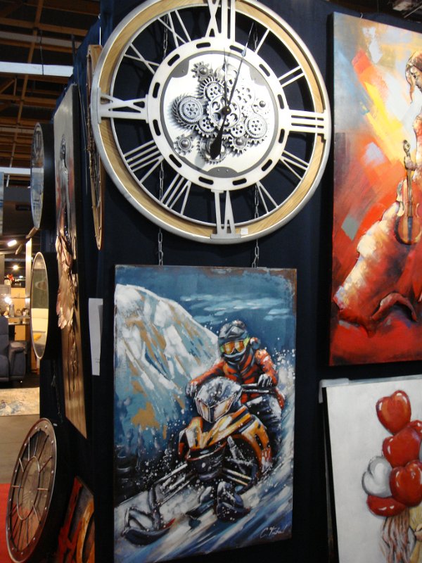La pluie ...... n'a pas dissuadé les visiteurs ...... et certains testent les fauteuils relax.À l'étage du mobilier, par curiosité ...... nous parcourons le stand Rochebobois.Rien de bien original.Un peu plus, mais pas follement pratique.Là, il faut aimer !Cette horloge, peut-être.^La section saunas est plus amusante. Labels Groisy