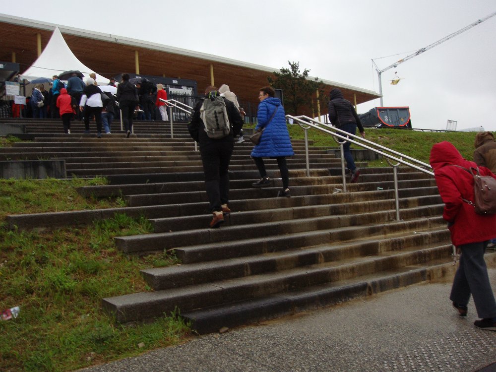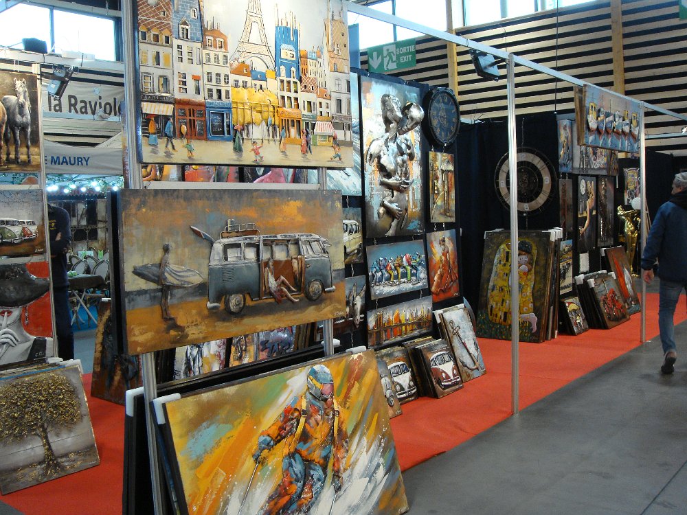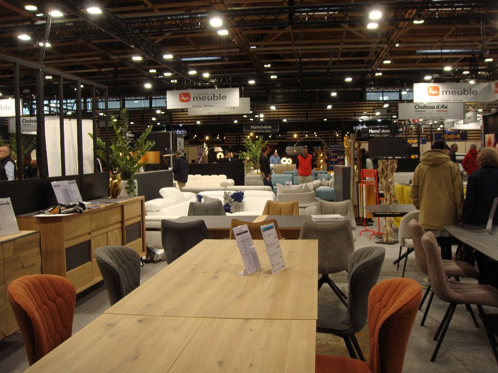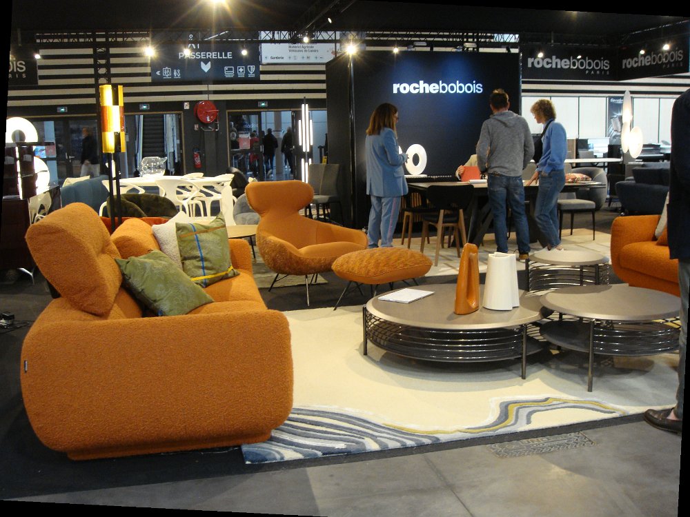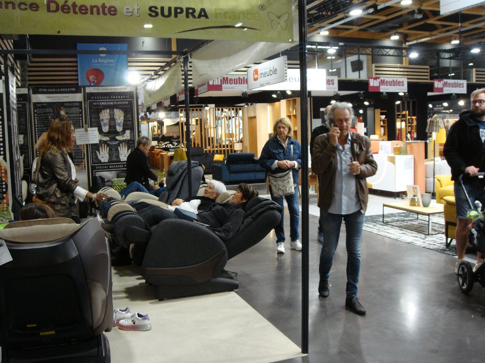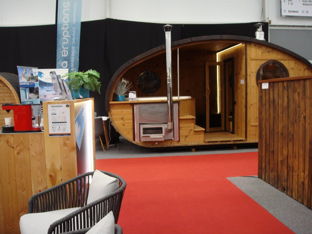 La pluie ...... n'a pas dissuadé les visiteurs ...... et certains testent les fauteuils relax.À l'étage du mobilier, par curiosité ...... nous parcourons le stand Rochebobois.Rien de bien original.Un peu plus, mais pas follement pratique.Là, il faut aimer !Cette horloge, peut-être.^La section saunas est plus amusante. Labels Groisy